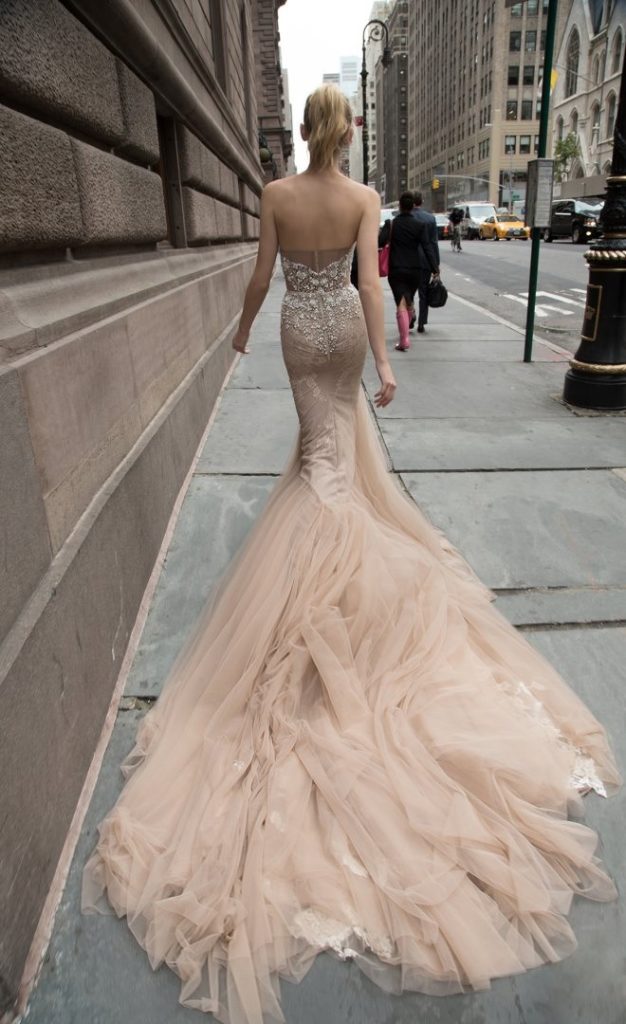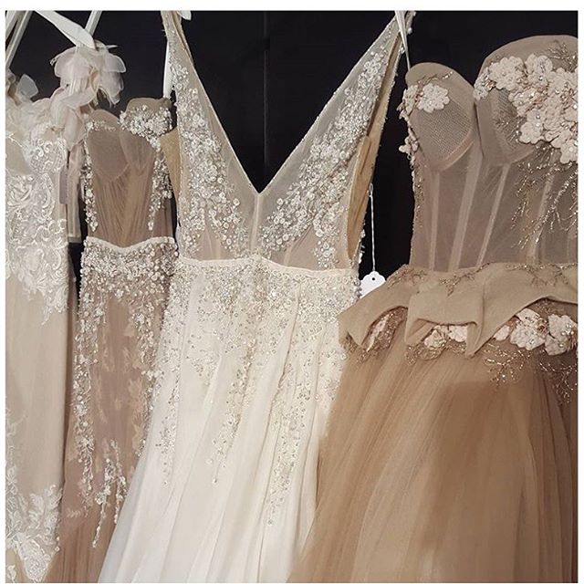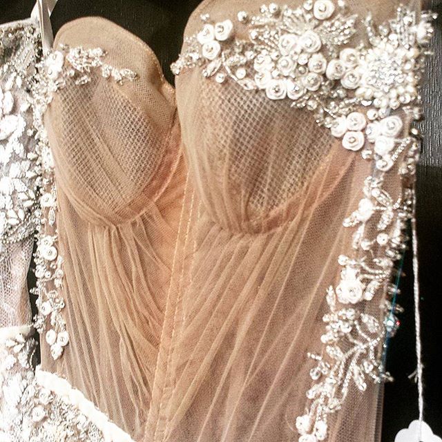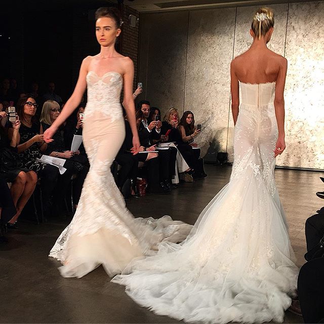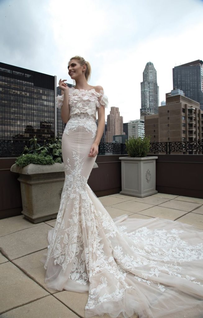 Ecco due bellissimi abiti da sposa a sirena in pizzo ricamato e gonna in tulle ricamato con fiori applicati e strascico con piume.