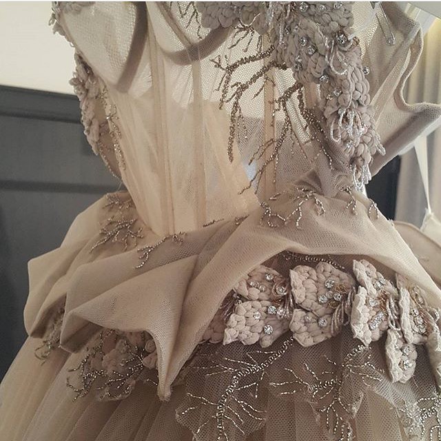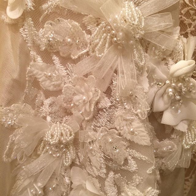 Ritroviamo la stessa ratio e realizzazione nel modello successivo, dalla diversa silhouette: un ampio ballgown “ballerina” con baschina e una fittissima lavorazione di ricami sul corsetto.