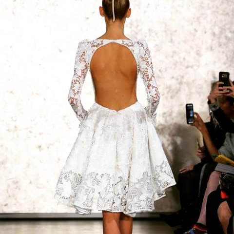 Delizioso l'abito da sposa corto in pizzo crochet con orlo più lungo dietro, tasche, maniche lunghe e schiena aperta.