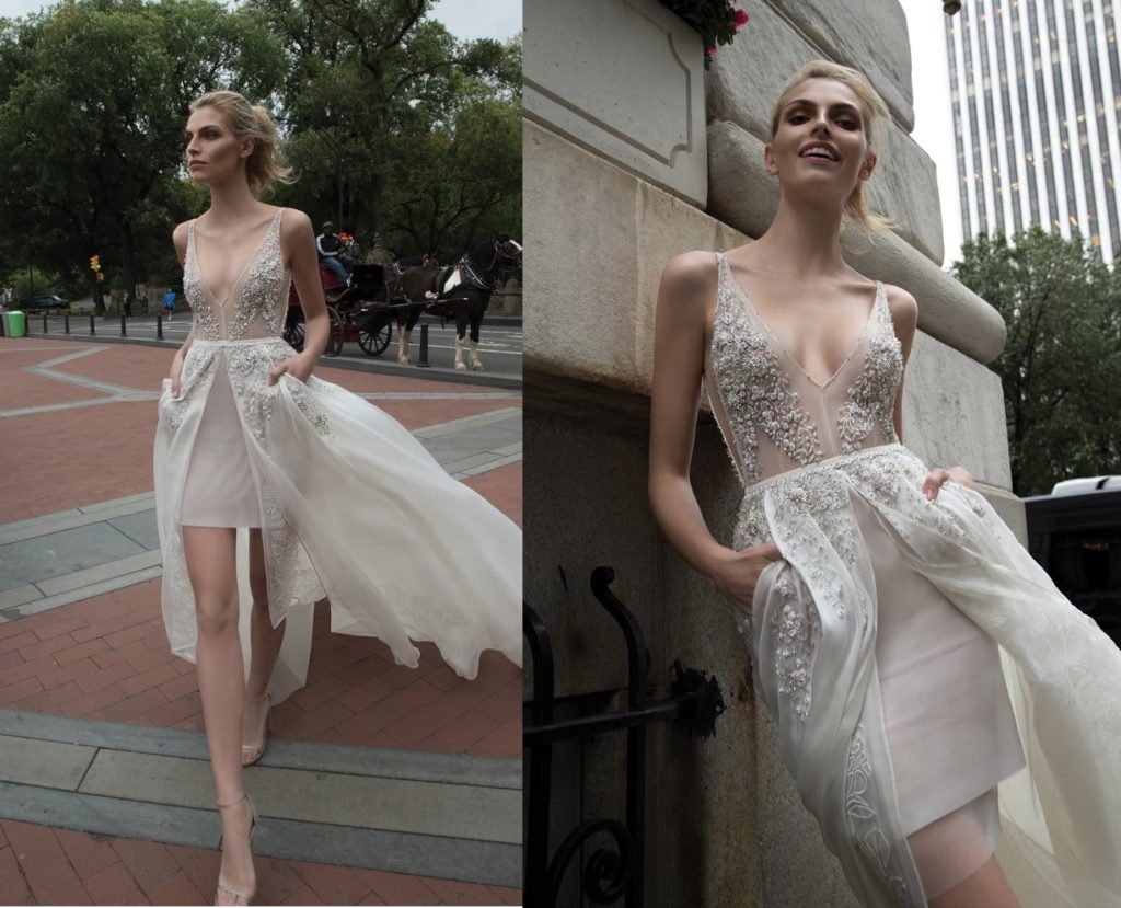 Molto versatile l'abito da sposa corto con sopragonna in organza ricamata e ricamo tagliato al laser.