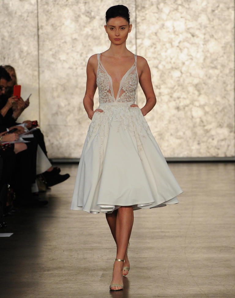 Elegantissimo l'abito da sposa lungo al ginocchio in crepe stretch con ricami in argento e sensuale scollatura.