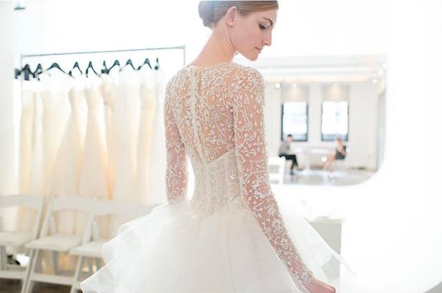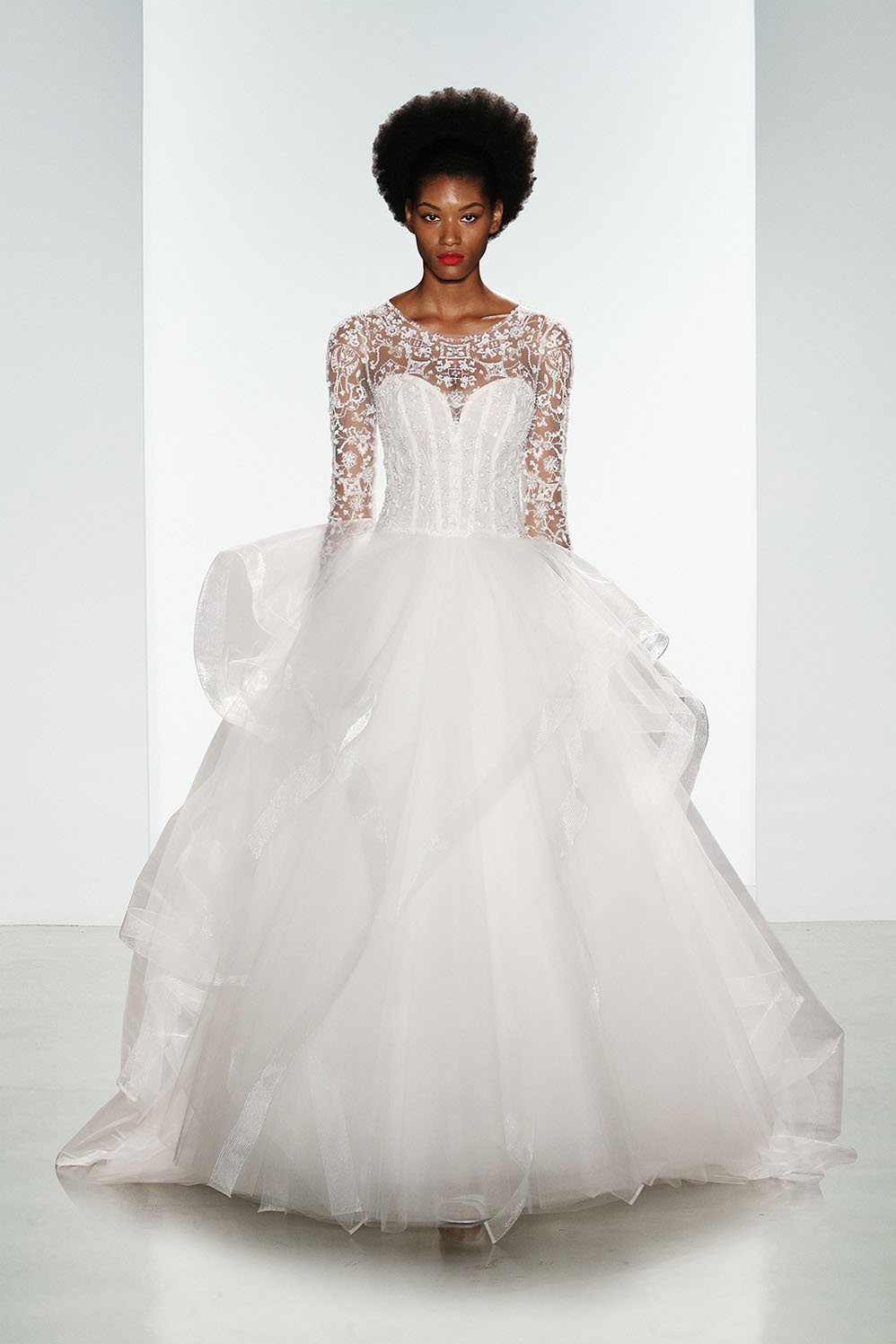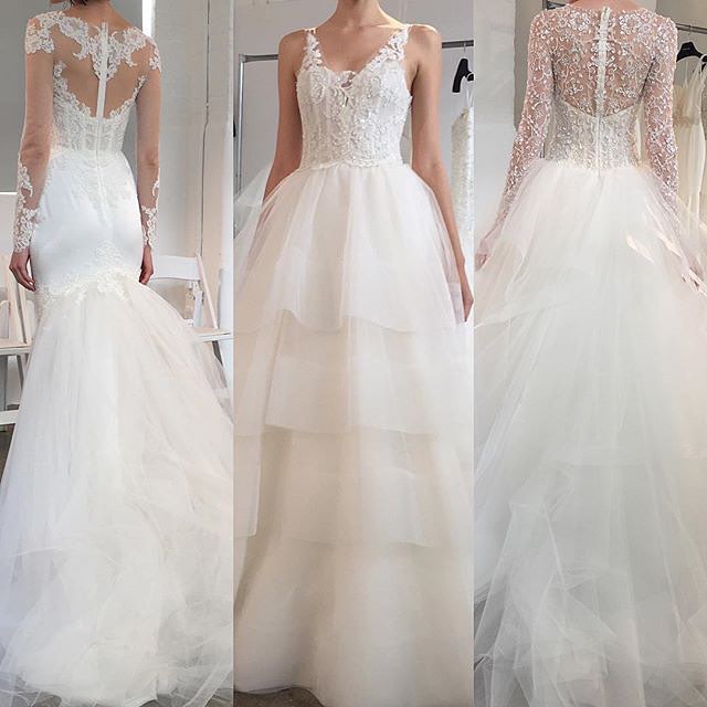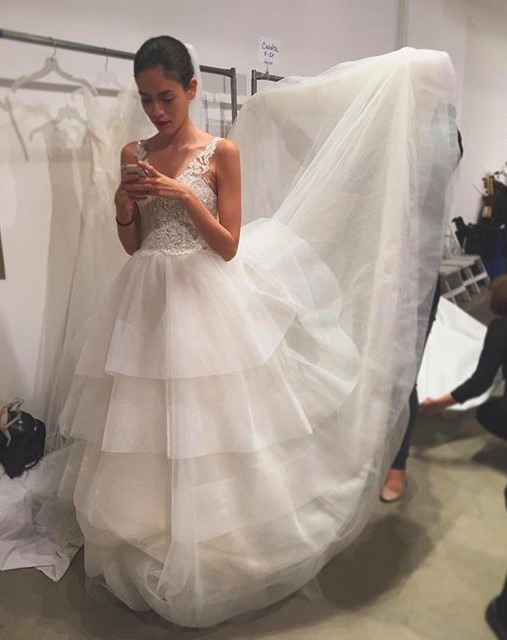 Cominciamo con l'abito più bello della collezione: Carmen. Lo splendido ballgown rievoca una sposa Grace Kelly contemporanea, una moderna principessa con ampia e vaporosa gonna in tulle, corpetto con scollo a cuore doppiato da tulle ricamato con maniche lunghe, scollatura e schiena velate.