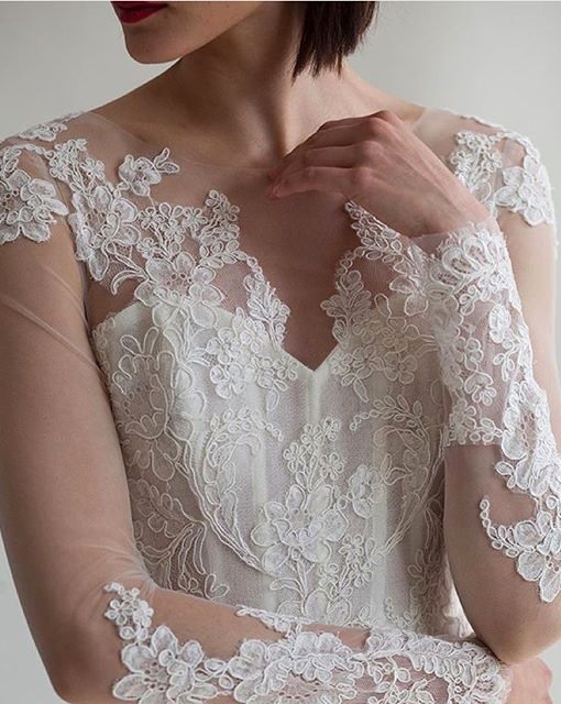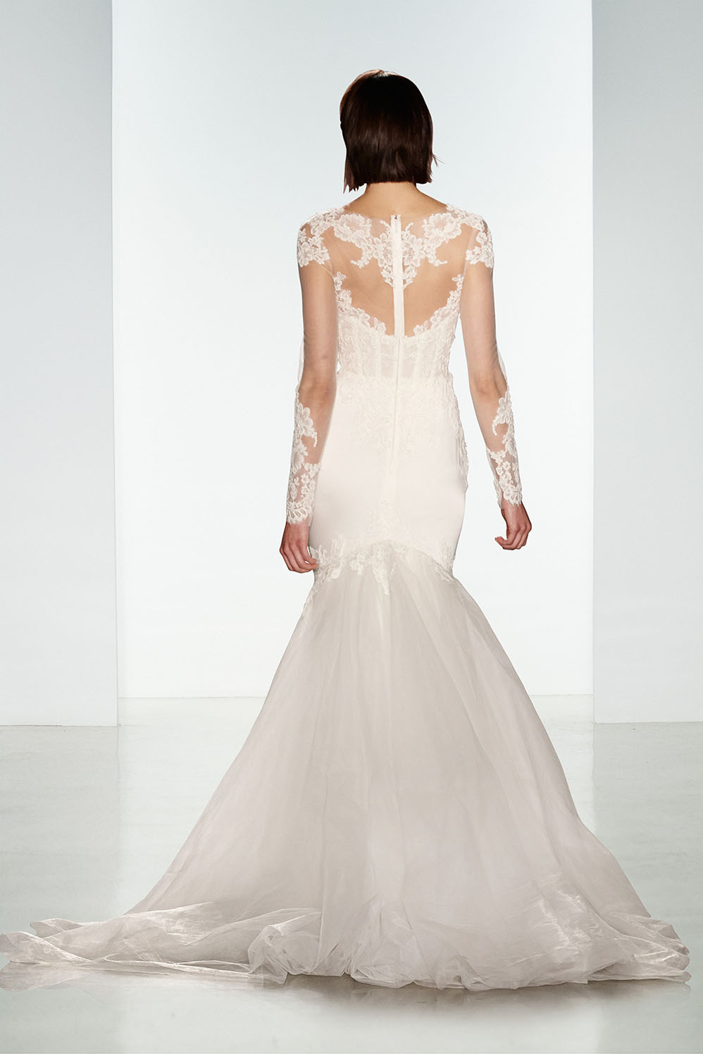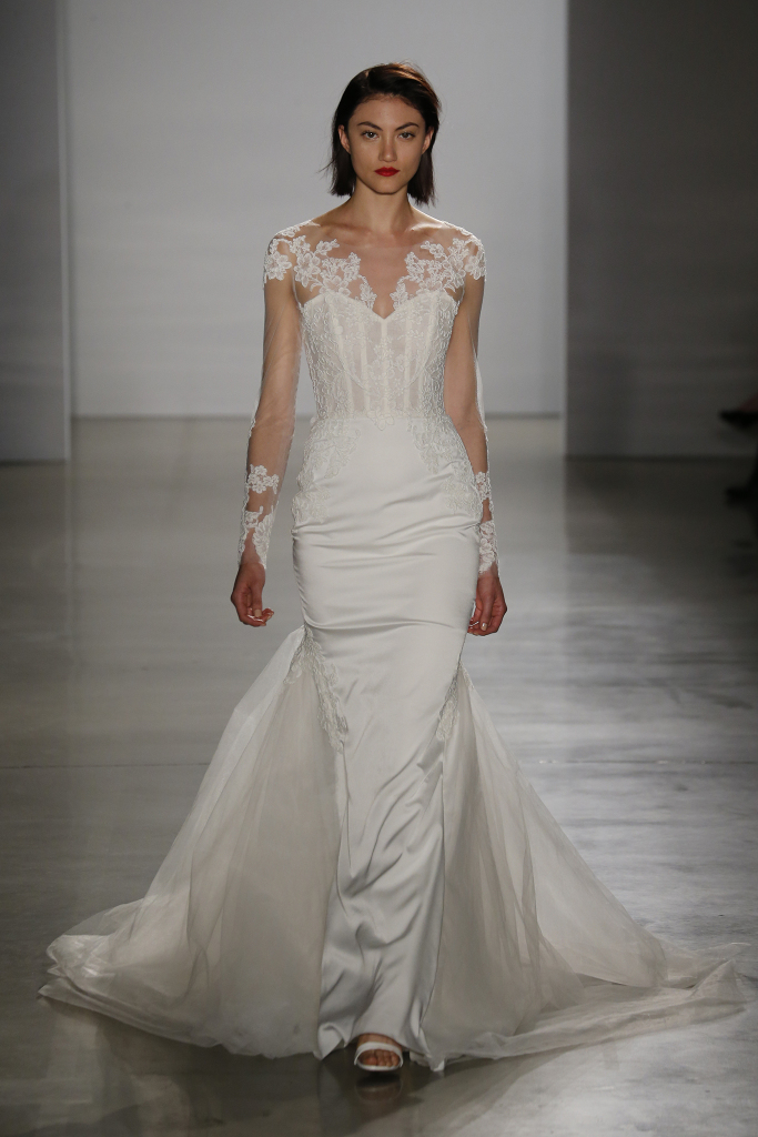 Corpetto velato ed inserti in pizzo Alençon anche sulle maniche lunghe per l'abito da sposa Evie, un modello svasato in seta charmeuse con sopragonna in tulle e schiena velata, dalla collezione sposa couture Kenneth Pool Fall 2016.