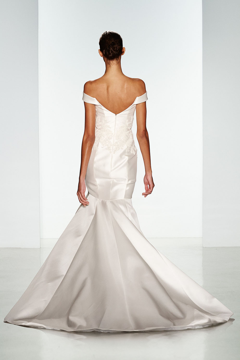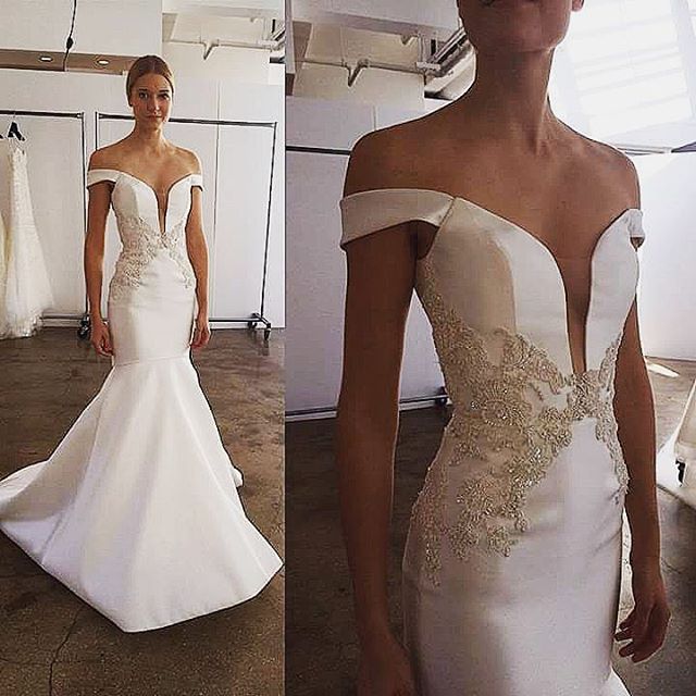 Super sofisticato e prezioso dalla collezione sposa couture Kenneth Pool Fall 2016 l'abito da sposa Mikayla, un modello svasato in seta Magnolia con scollatura off the shoulder e applicazione in pizzo Alençon sul corpetto.