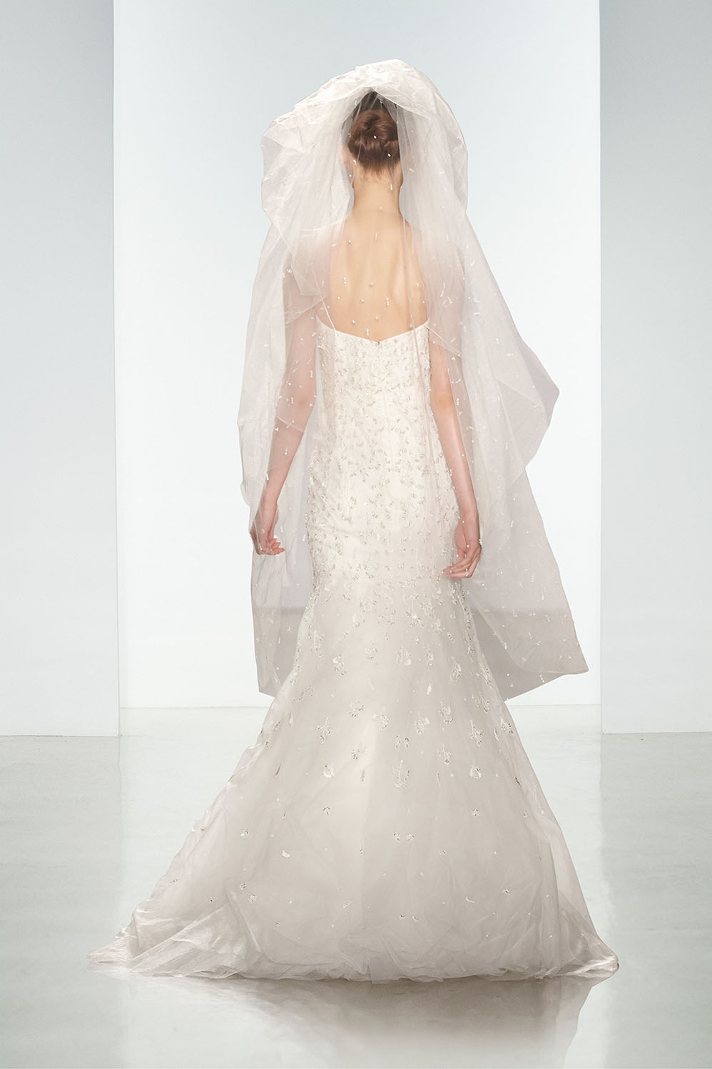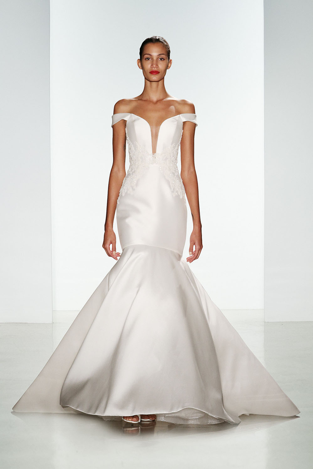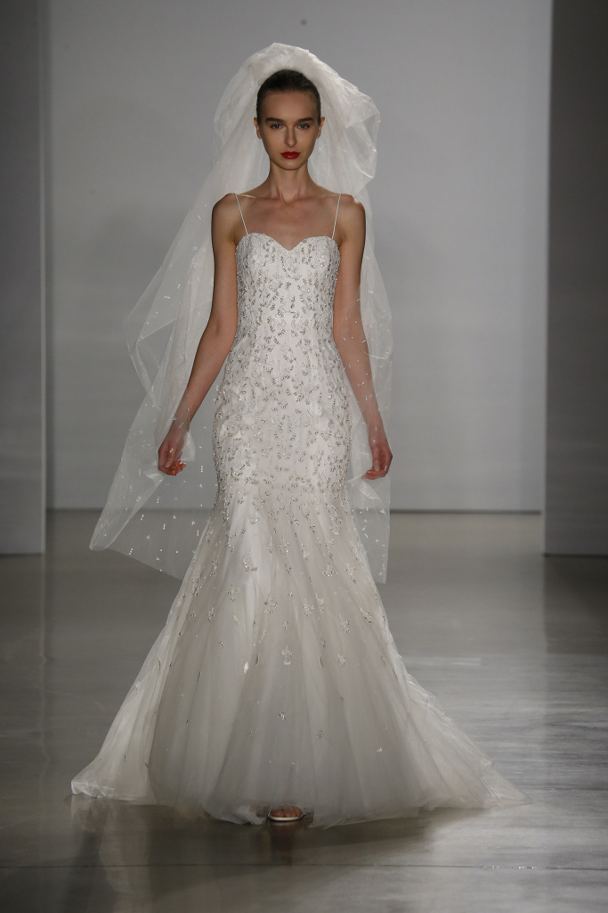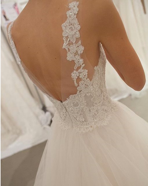 In chiusura, lucentissimo l'abito da sposa svasato Zandra, con cristalli Swarovski, sottili spalline e gonna in tulle.
