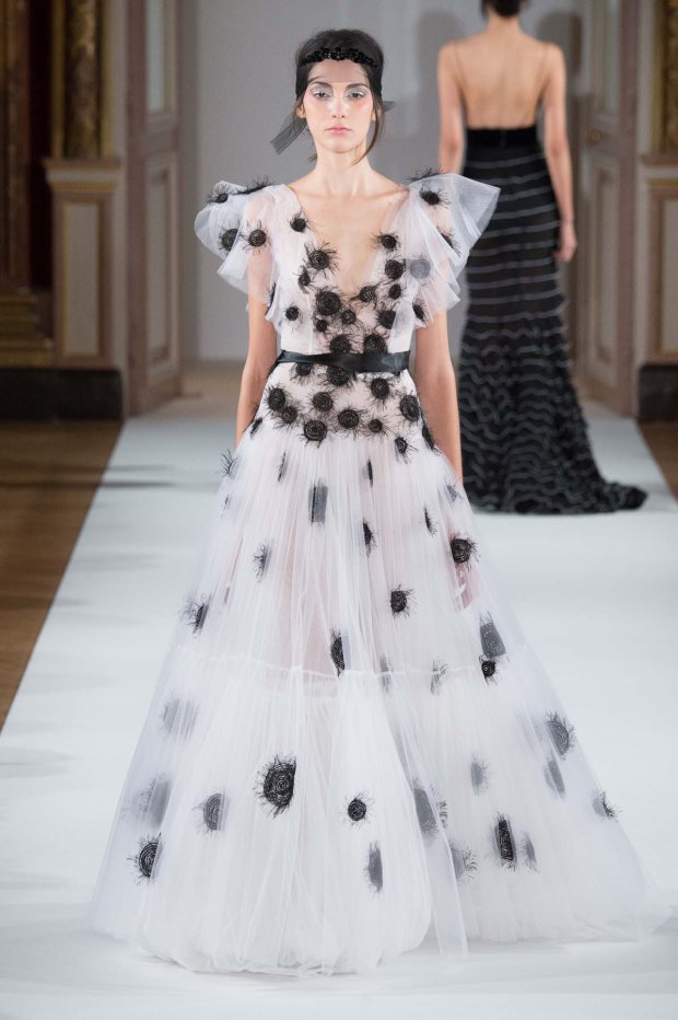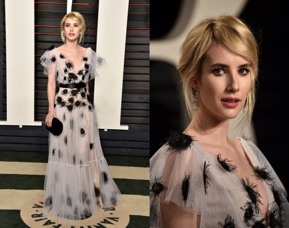 Infine, ispirazione sposa anche per Emma Roberts in abito Yanina Couture Spring 2016, un modello bianco in tulle con applicazioni a fiore in piume nere.