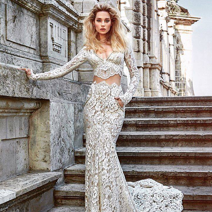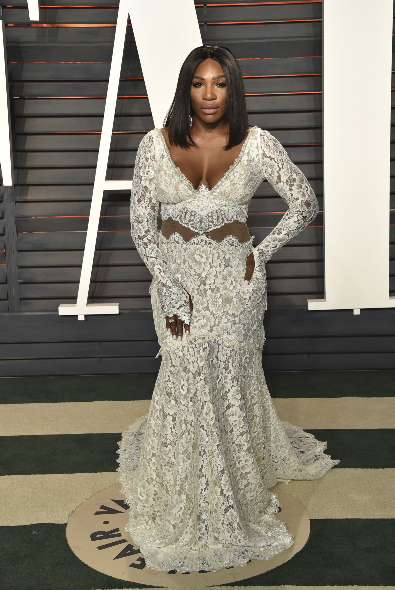 Un vero proprio look da sposa per Serena Williams in Galia Lahav. La celebre tennista ha avvolto le generose curve in un modello in pizzo dalla collezione sposa Galia Lahav, costituito da gonna a sirena con lungo strascico e tasche e corpetto crop-top con maniche lunghe. Una scelta davvero coraggiosa e di stile.