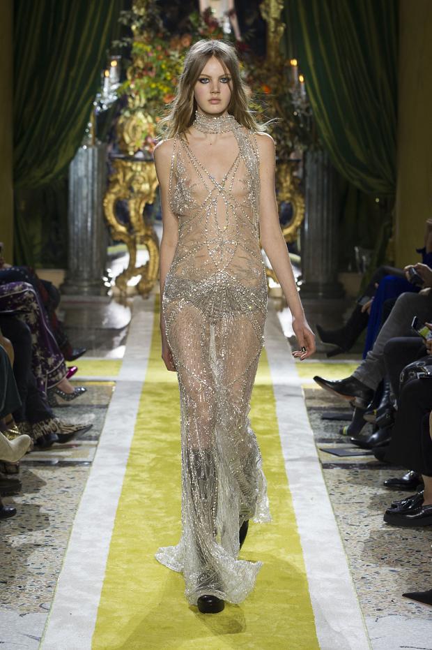 Davvero coraggiosa e super glam la supermodella Natasha Poly in Roberto Cavalli RTW Fall 206, un modello appena presentato alla Milan Fashion Week, la settimana della moda milanese che si è da poco conclusa. Si tratta dell'abito finale mostrato in passerella, un modello in tulle ricamato che lascia pressoché nulla all'immaginazione, disegnato dal direttore creativoPeter Dundas nell'ambito di una collezione ispirata al rock.