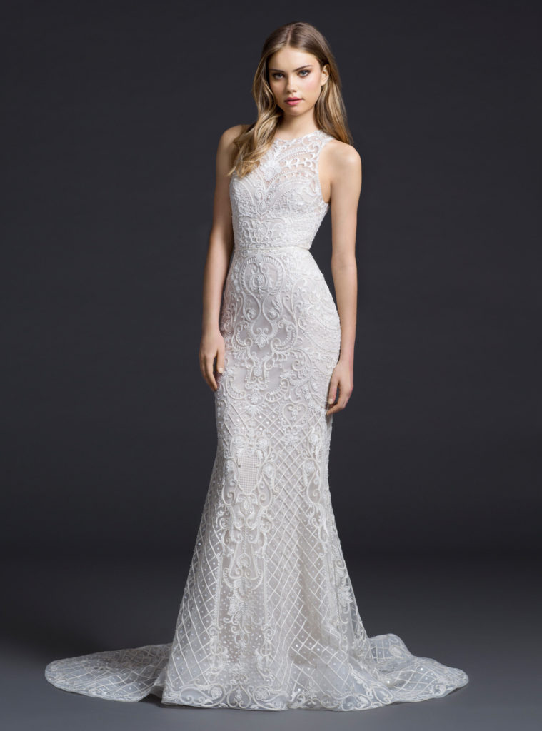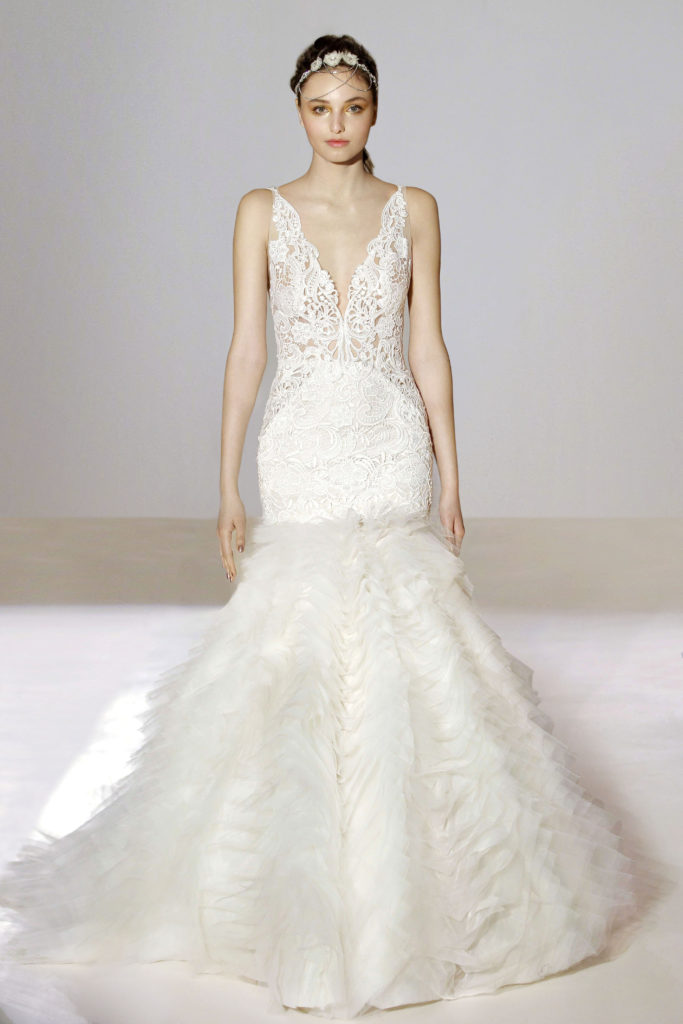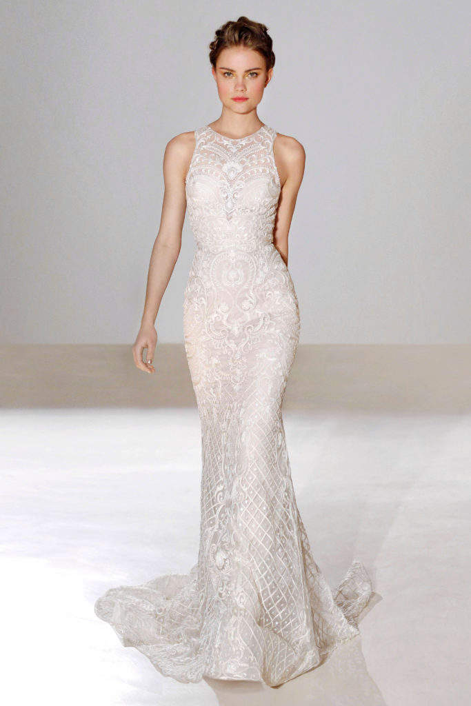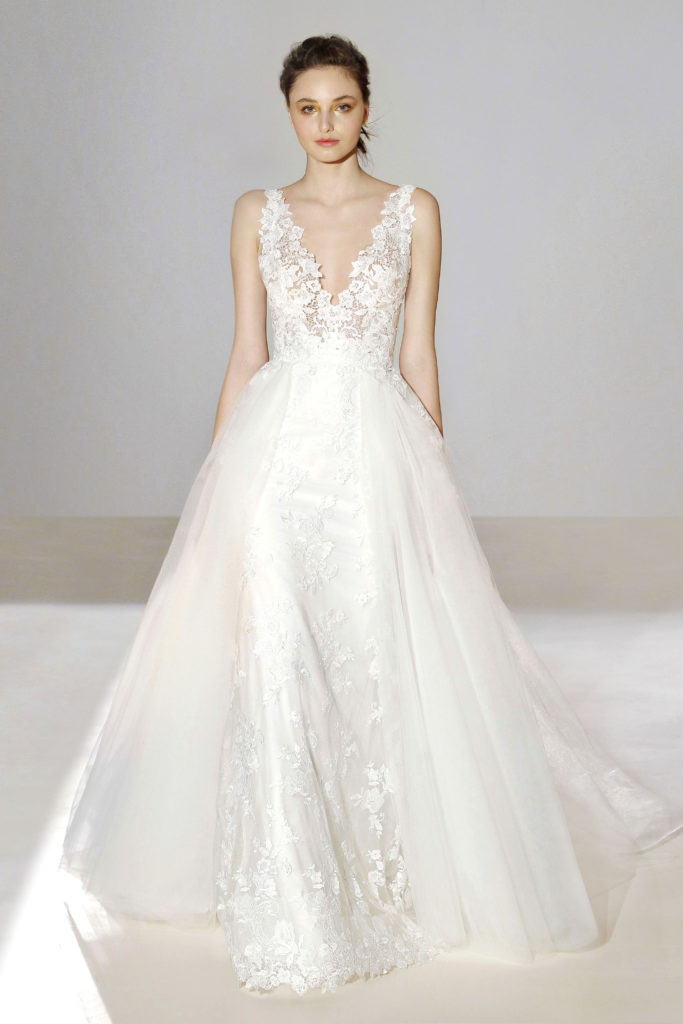 La collezione sposa Lazaro Fall 2016 si apre con un abito da sposa svasato in chiffon arricchito da una fitta rete di ricami avorio, con scollo a canottiera e schiena velata ricamata.