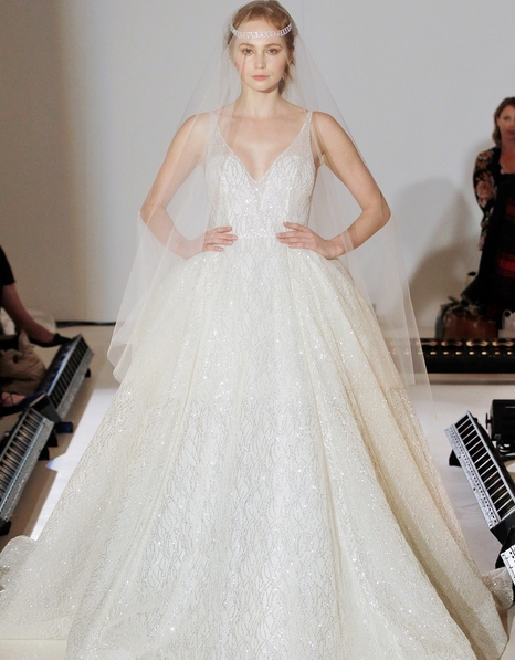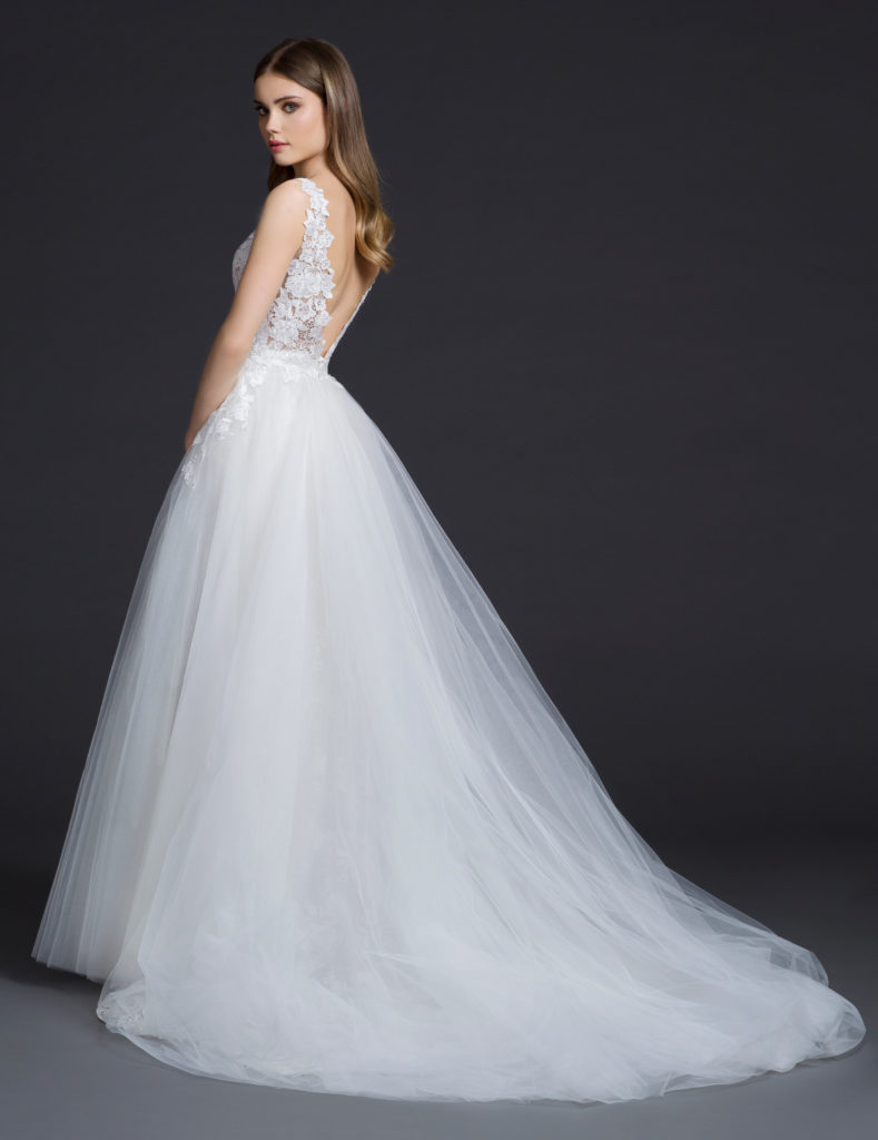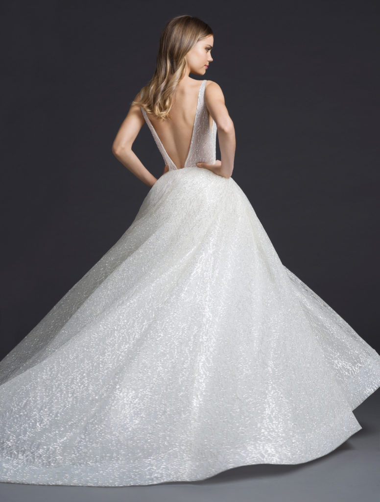Un abito da sposa da fiaba per questa collezione sposa Lazaro Fall 2016 in tulle con fitti ricami argento, con scollo a V fronte e retro e gonna a pieghe, perfetto per la sposa che vuole vivere un sogno.