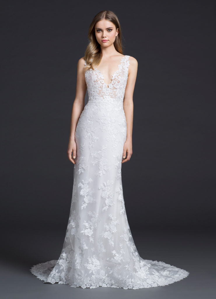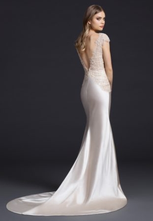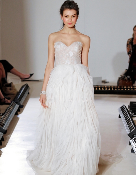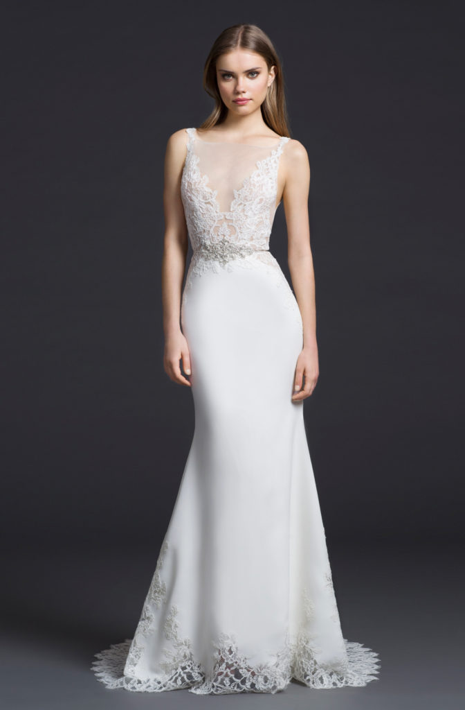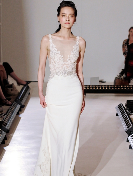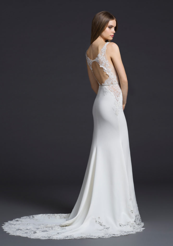 Lazaro Fall 2016Perfetto per valorizzare la silhouette l'abito da sposa svasato in crepe con corpetto velato arricchito da cristalli e applicazioni in pizzo Alencon, schiena a oblo e inserti velati sui fianchi e sull'orlo.