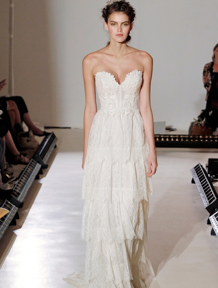 Molto giovanile l'abito da sposa in pizzo Chantilly su chiffon color carne, con gonna a balze e corpetto senza spalline dallo scollo a cuore.