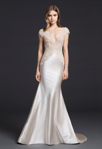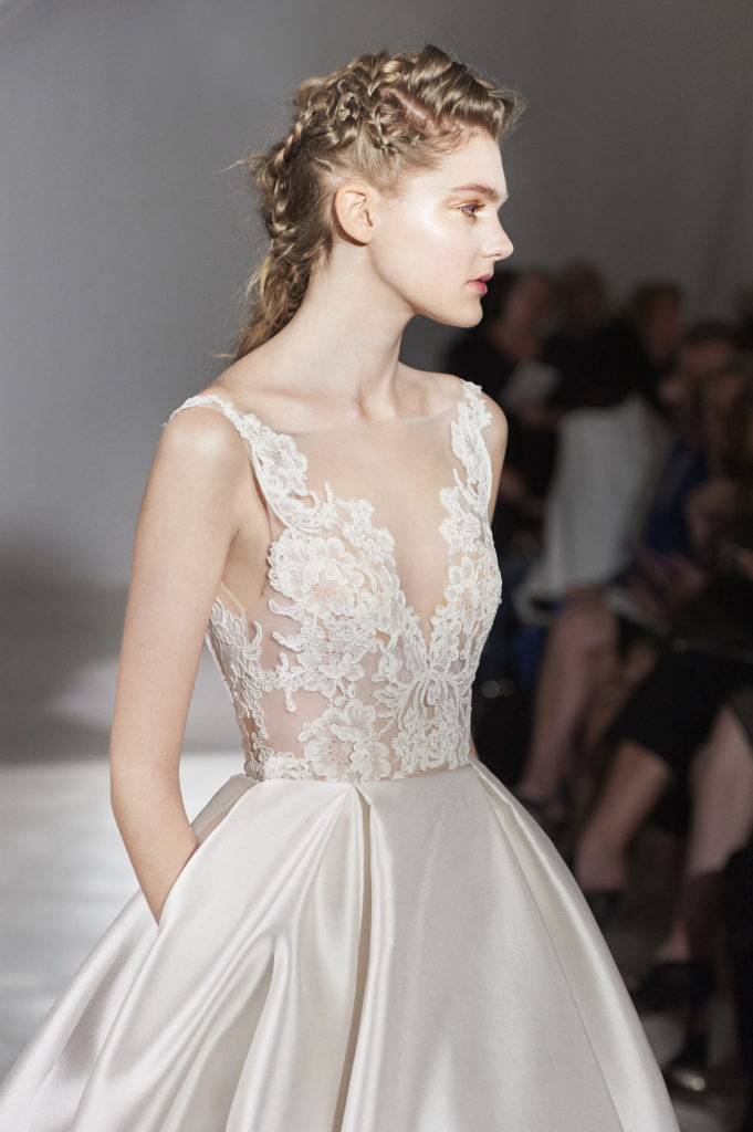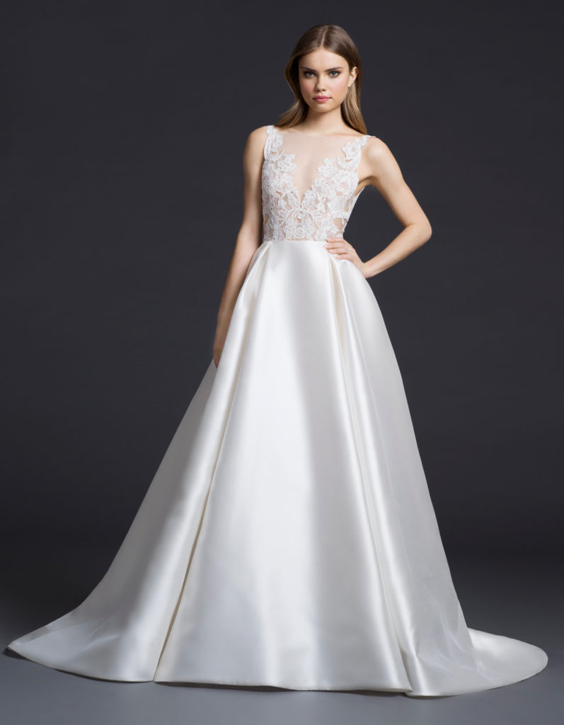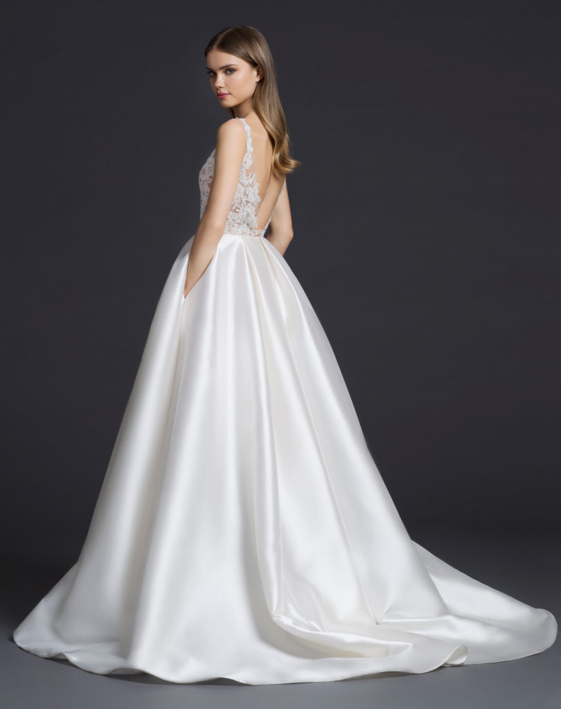 Romantico e moderno, sempre dalla collezione sposa Lazaro Fall 2016, il ball gown in mikado avorio abbinato a corpetto con applicazioni in pizzo Alencon, scollo a V fronte e retro e tasche.