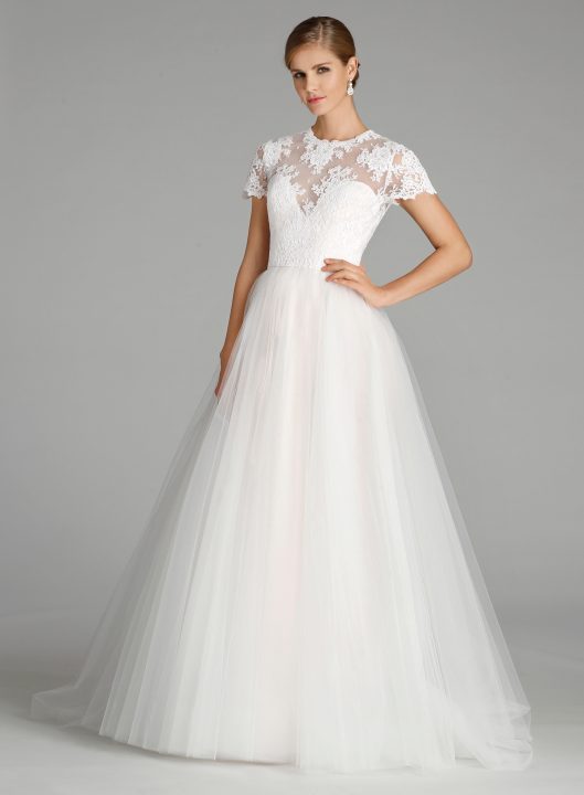 Ed ecco introdurre nella collezione sposa Alvina Valenta Fall 2016 l'abito da sposa da principessa con corpetto a strati in pizzo Alencon e a bocciolo, collo gioiello e maniche delicate, ampia gonna in tulle. La schiena è velata in pizzo.