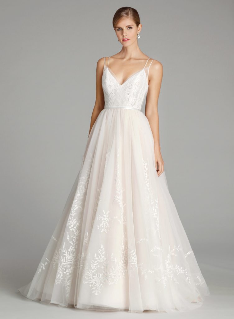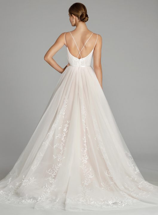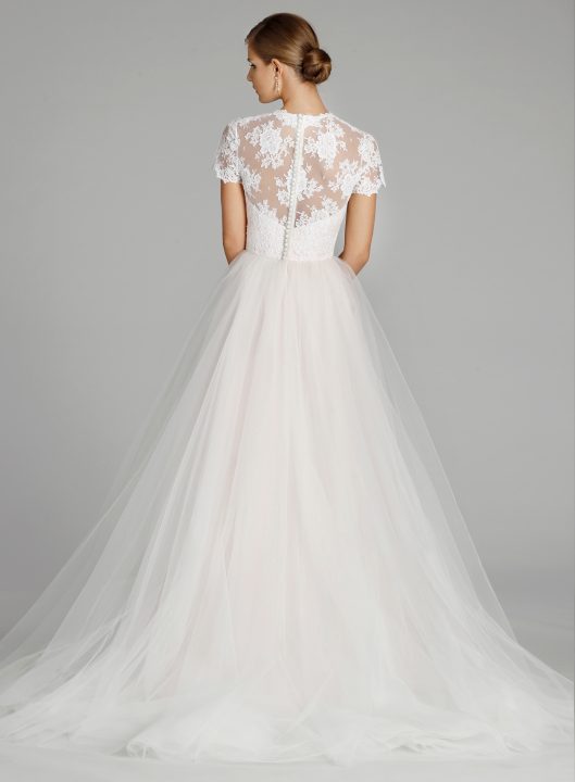 In chiusura, ancora un ball gown in tulle con delicato ricamo floreale su tutta la gonna, pizzo sul tulle drappeggiato, corpetto ballerina con scollo a V e spalline che si incrociano sulla schiena.