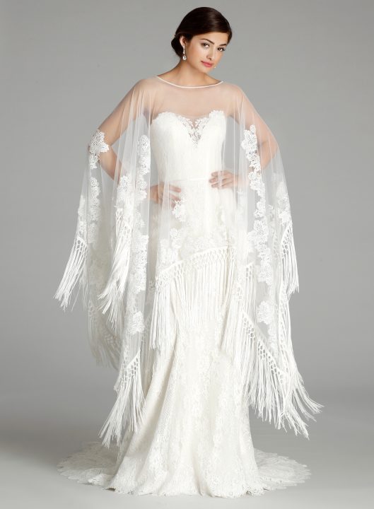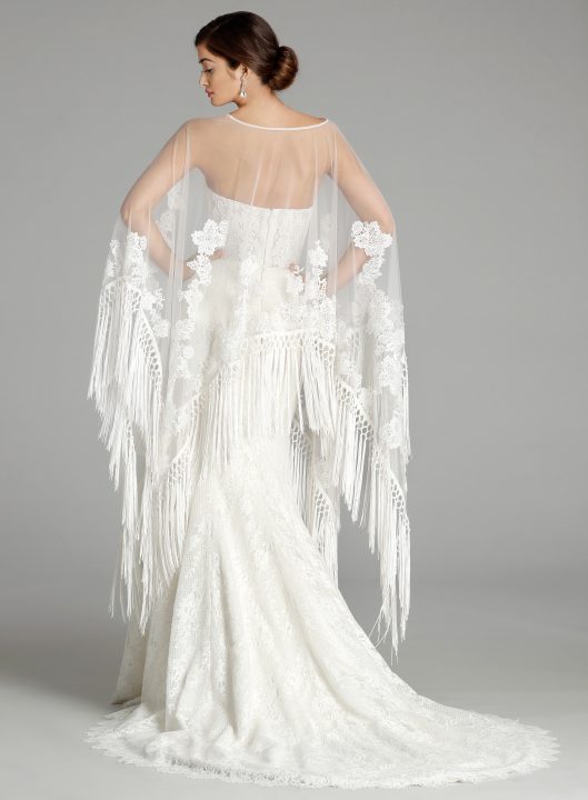 Svasato l'abito da sposa senza maniche avorio, presentato con poncho in pizzo a frange.