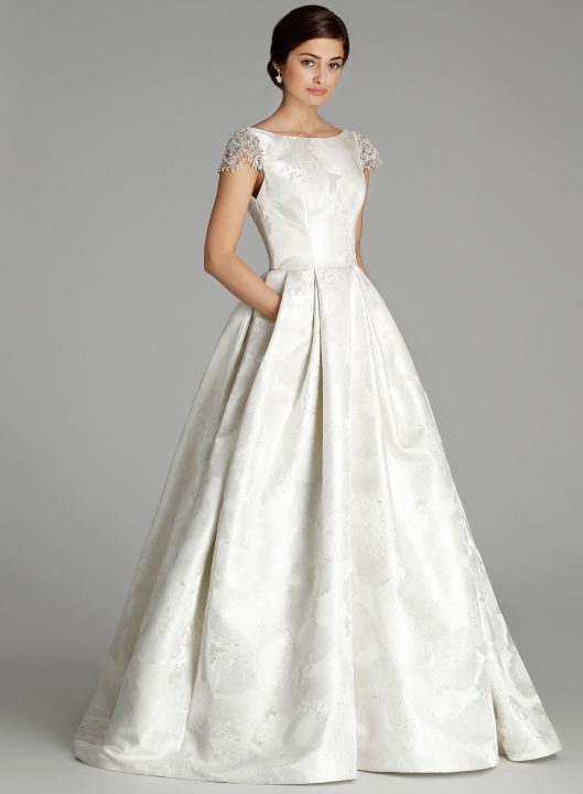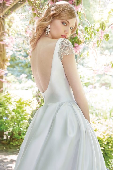 Eleganza senza tempo e contemporaneità si sposano in questo bellissimo ball gown in mikado, con scollo a barchetta, schiena aperta, tasche e maniche a coppetta gioiello che donano all'abito quel tocco glam che la sposa di oggi vuole.