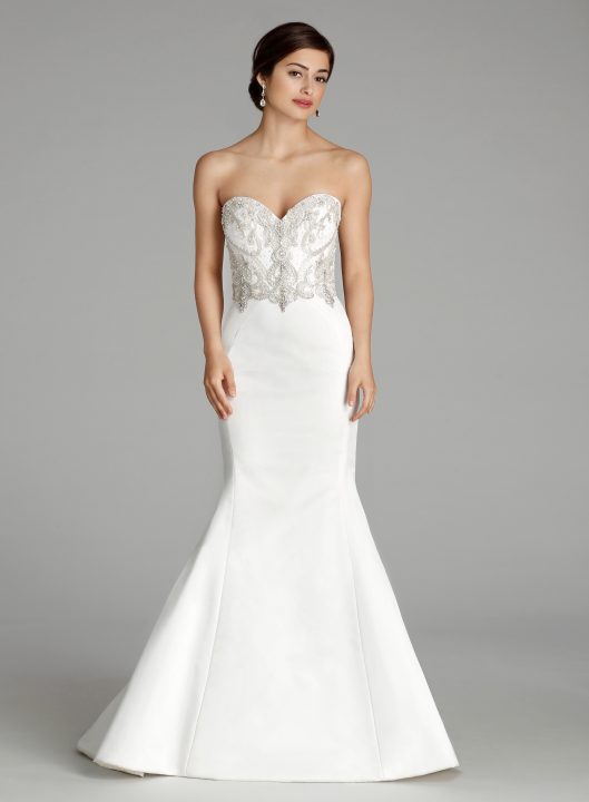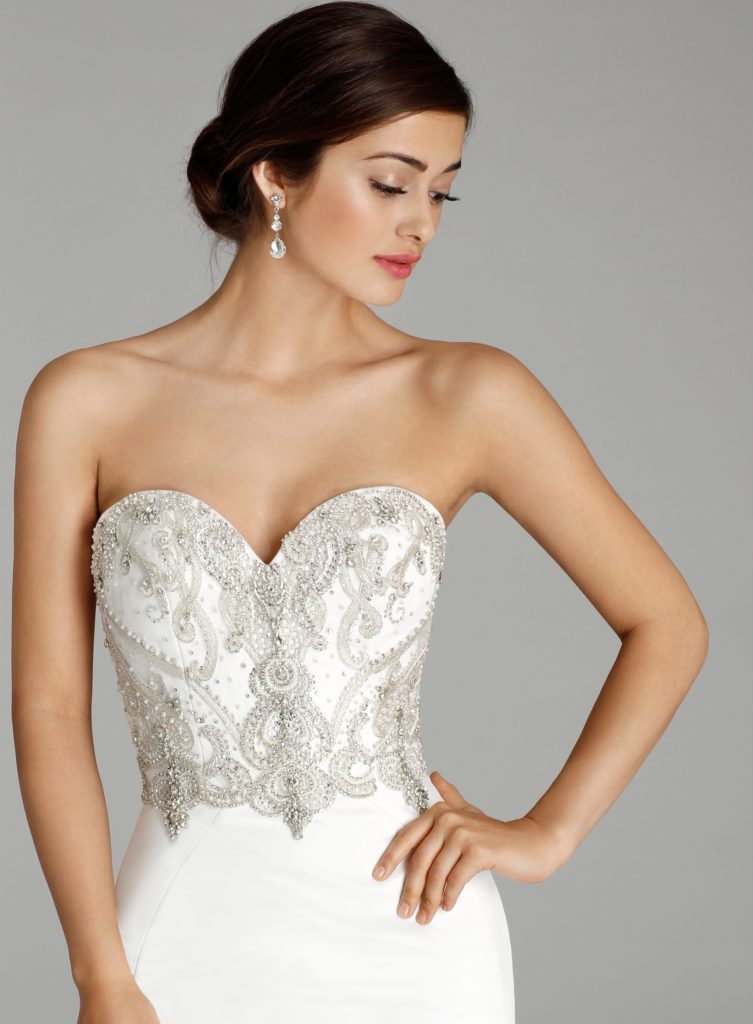Perfetto per valorizzare la figura femminile in questa collezione sposa Alvina Valenta Fall 2016, l'abito da sposa bustier svasato in duchesse di seta con corpetto gioello.