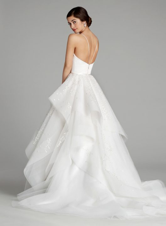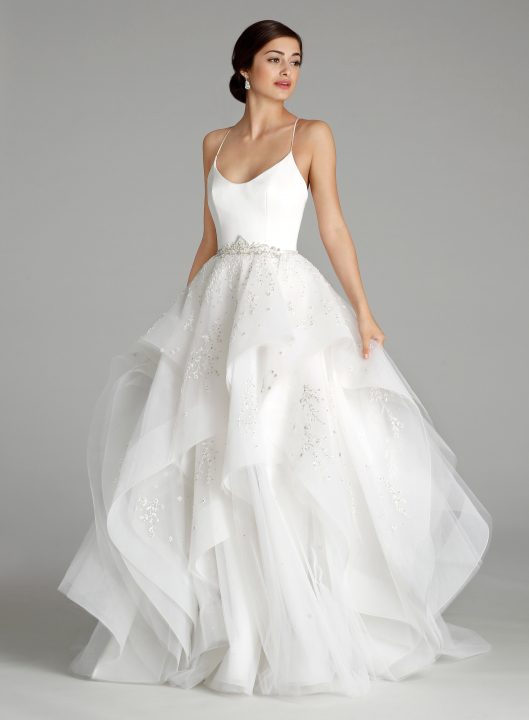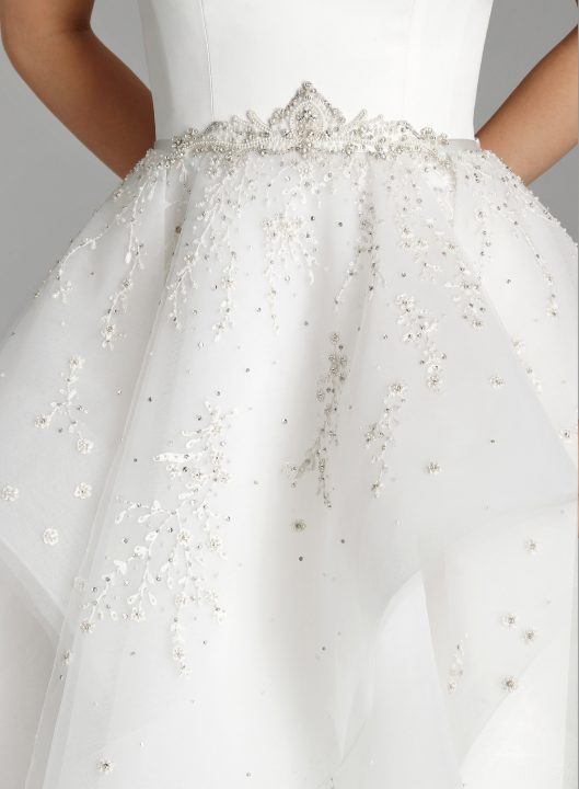 Il primo modello è davvero un abito da sposa da fiaba con gonna a strati asimmetrici in tulle e corpetto in duchesse di seta, lo scollo è da ballerina e le spalline sottili, mentre una cascata di ricami scintillanti arricchisce la gonna.