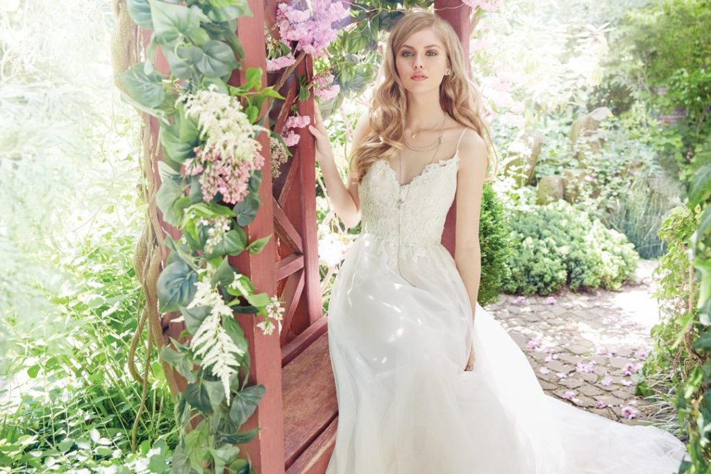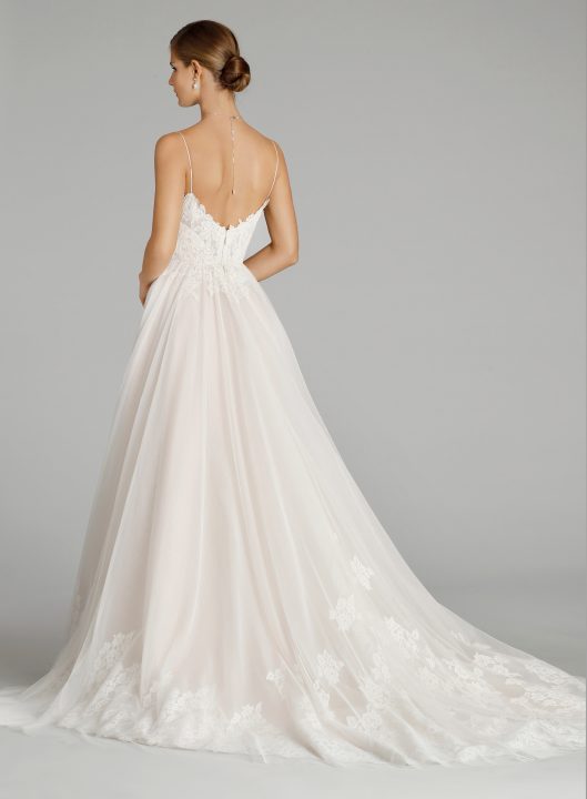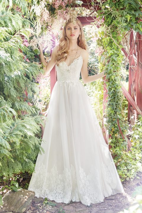 Ancora un abito da sposa da fiaba con questo modello dalla gonna a strati asimmetrici in tulle, corpetto con spalline sottili, scollo a V e pizzo a cascata color glicine, mentre la schiena è velata in pizzo e la vita è racchiusa da un nastro in satin.
