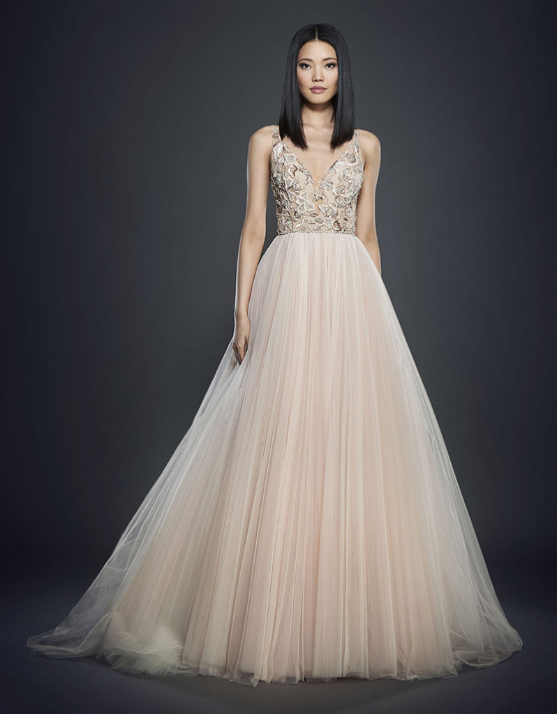 Davvero strepitoso è l'abito da sposa rosa con gonna in tulle a sbuffi e corpetto con fitti ricami lucenti su scollo a V.