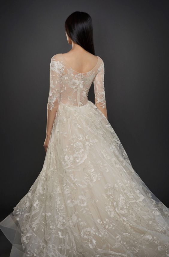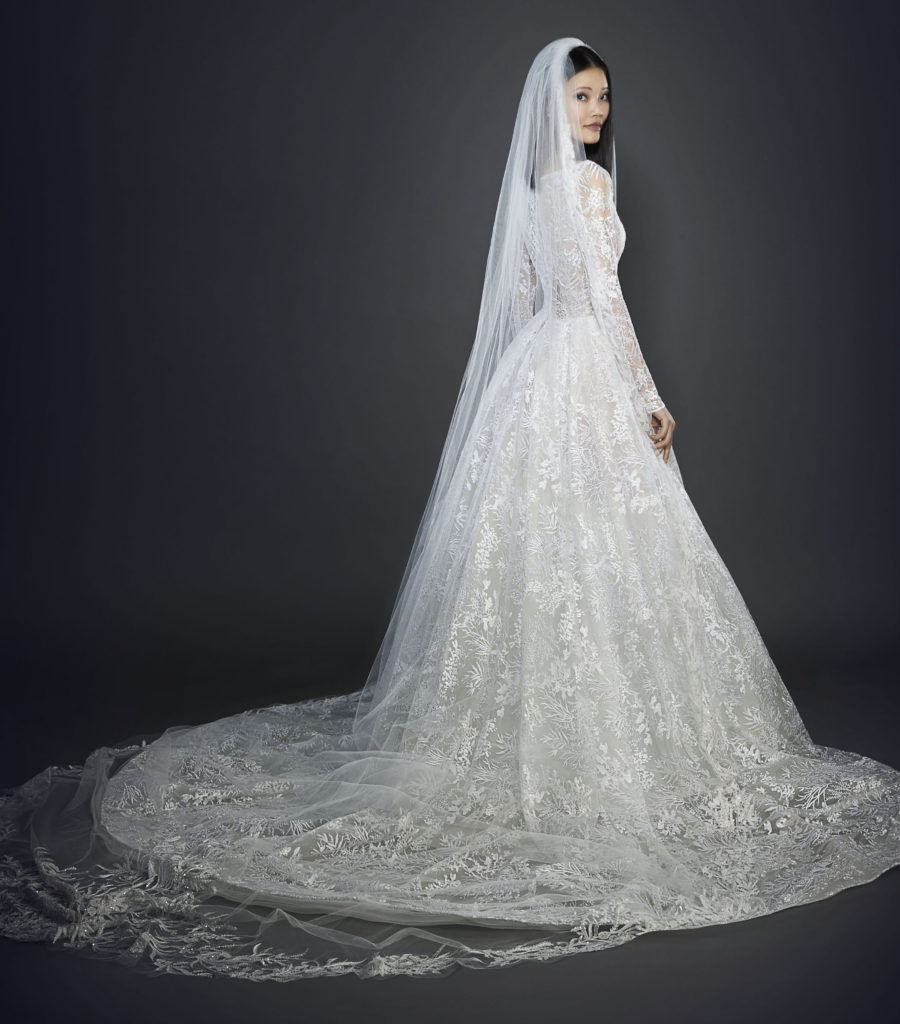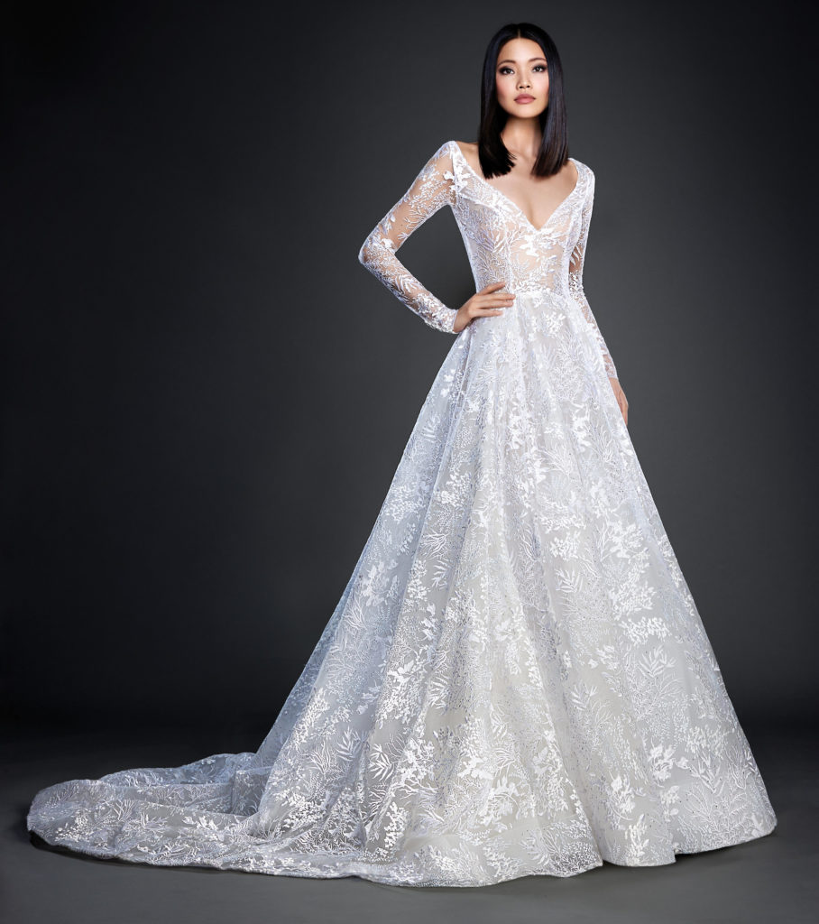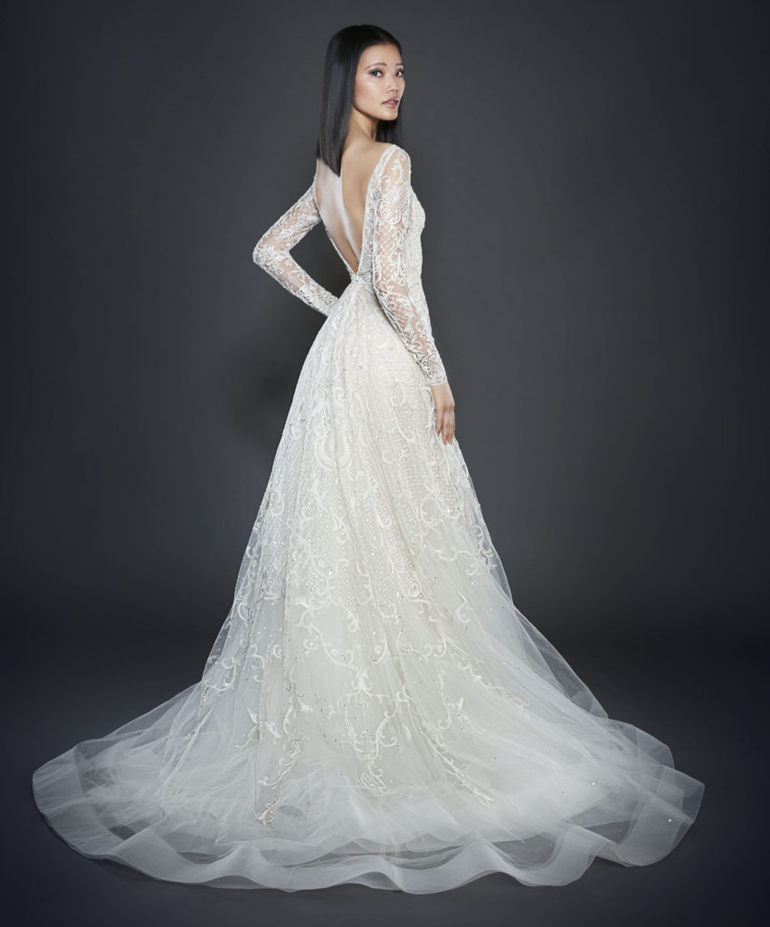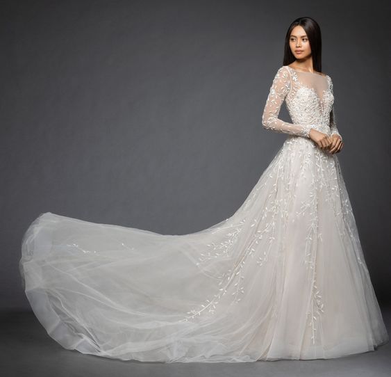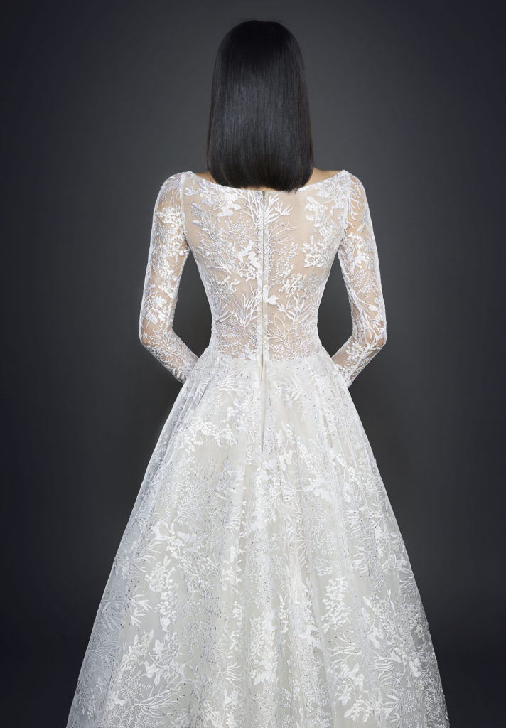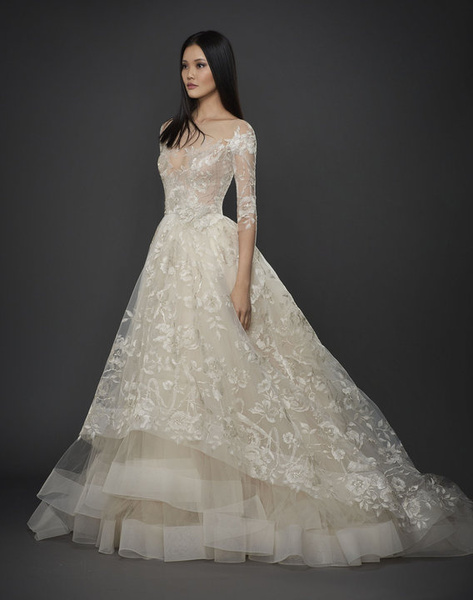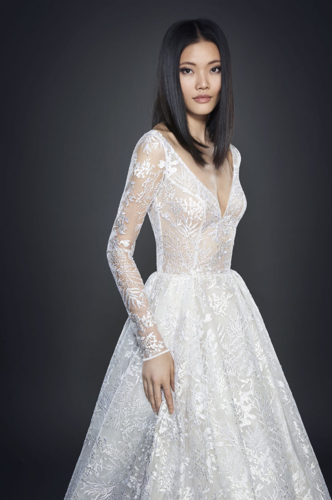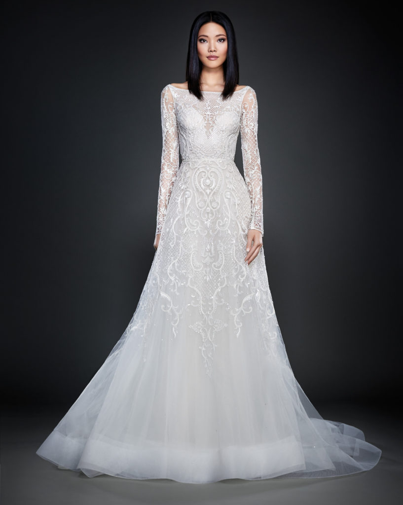 La collezione sposa Lazaro Spring 2017 comprende anche un abito da sposa A-line in tulle con fitti ricami, scollo a barchetta e a V sulla schiena e lunghe maniche velate.