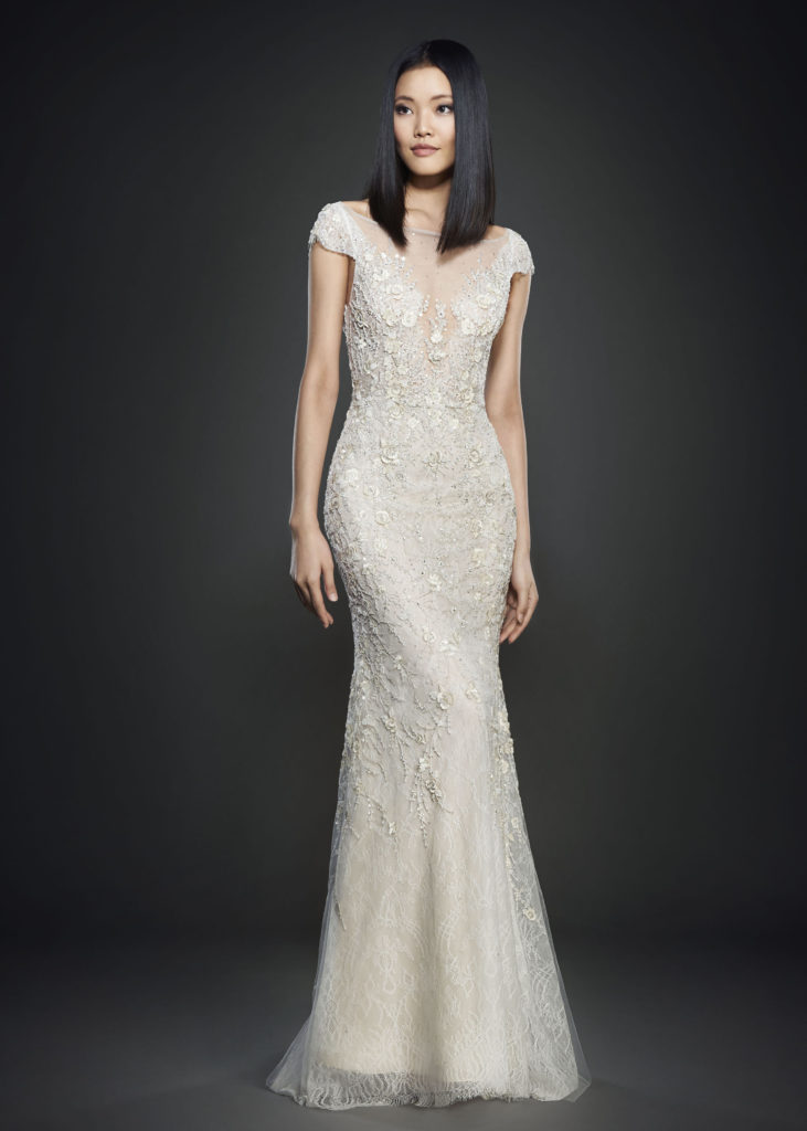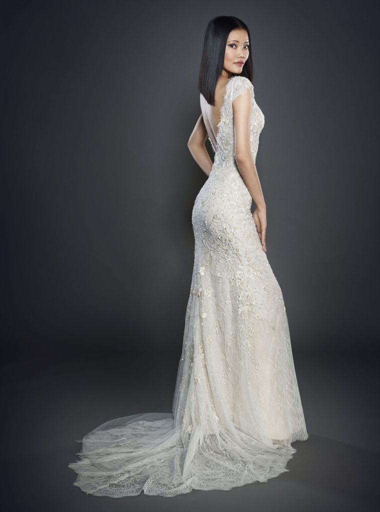 Ancora da questa collezione sposa Lazaro Spring 2017 un abito da sposa scivolato in pizzo Chantilly con sovrapposta una rete di ricami, scollo a barchetta velato con scollo a V fronte retro, maniche a coppetta e lungo strascico.