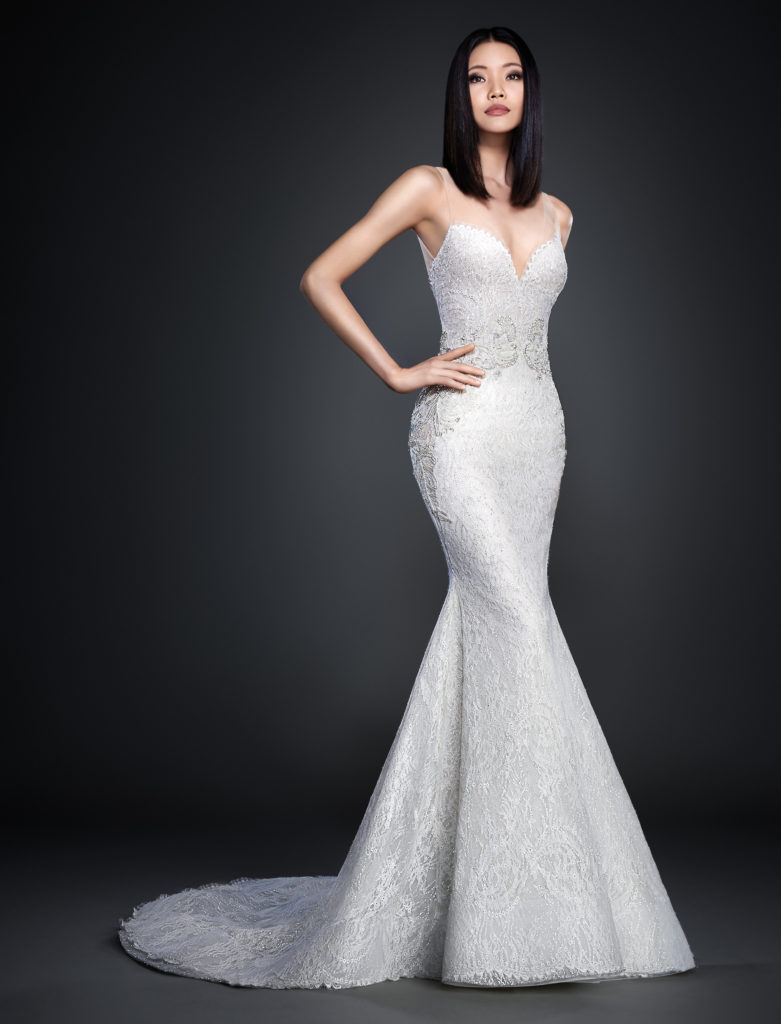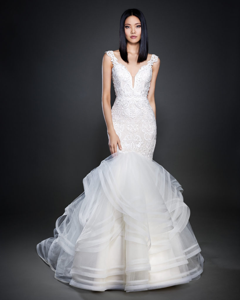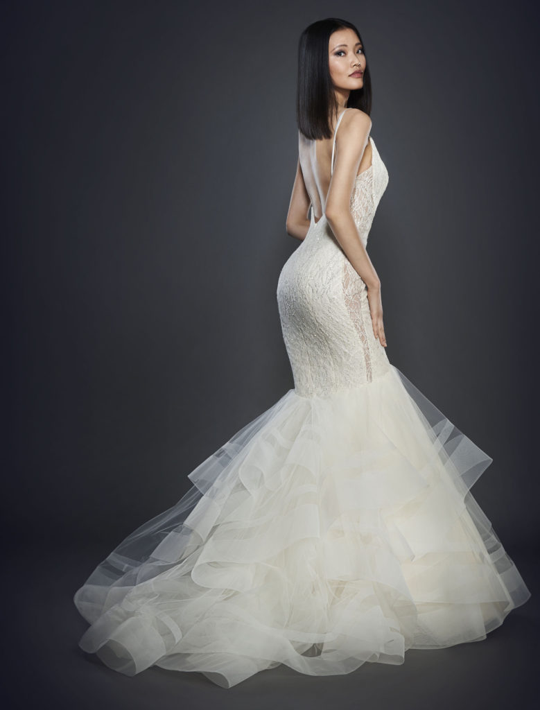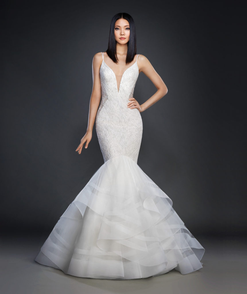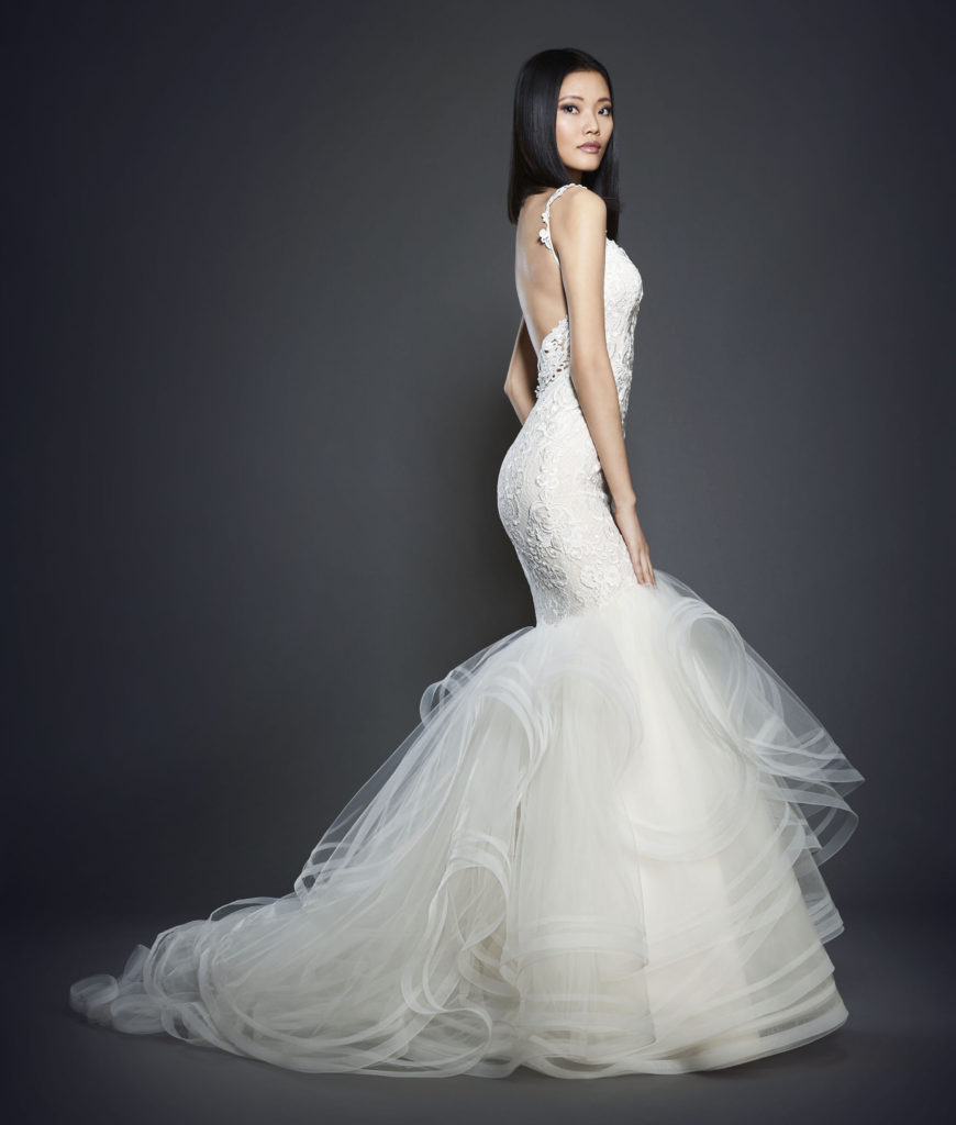 Passiamo poi ad ammirare dalla collezione sposa Lazaro Spring 2017 i modelli a sirena, molto sensuali e perfetti per valorizzare la silhouette.