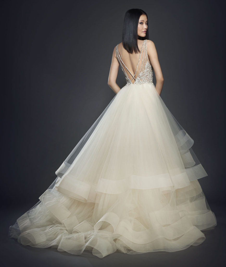 Ancora nella collezione sposa Lazaro Spring 2017, l'abito da sposa color avorio in tulle con spalline incrociate, scollo a V fronte e retro, gonna strati con orlo in crine di cavallo.