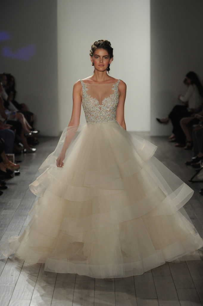 Ancora fitti ricami sul corpetto dell'abito da sposa in tulle Champagne, scollo velato e gonna in ampie balze con orlo in crine di cavallo.
