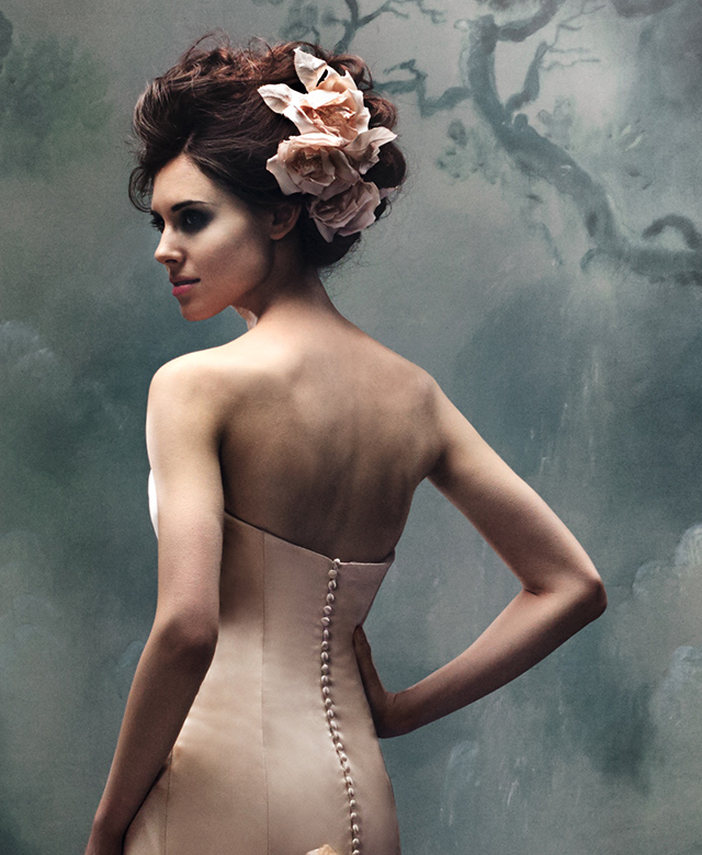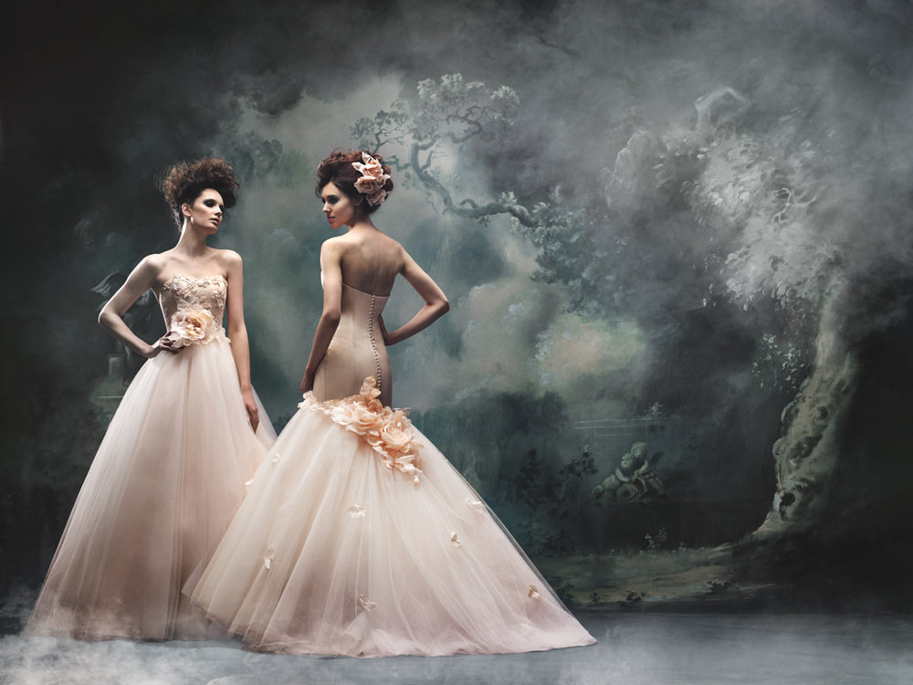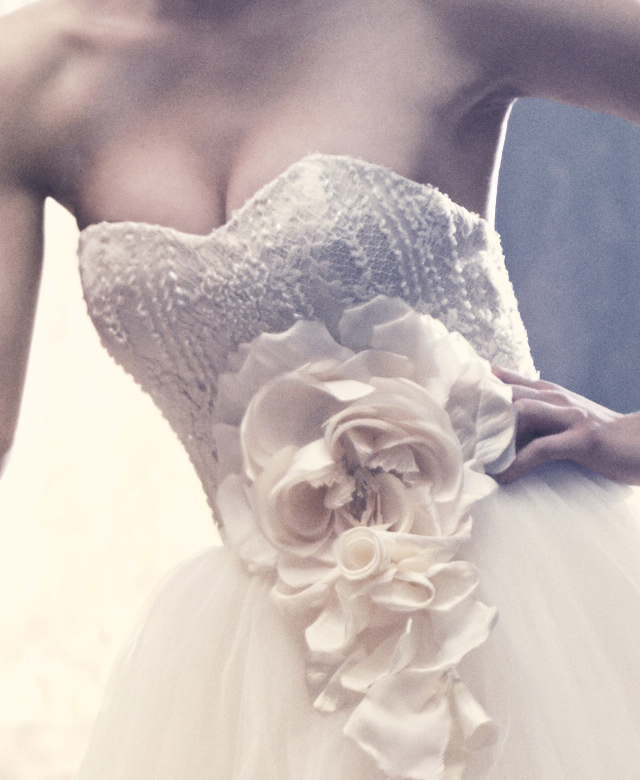 I corsetti che scolpiscono il corpo si abbinano perfettamente alla silhouette femminile, creando una perfetta figura a clessidra. L'utilizzo di morbidi toni pastello come cipria, champagne e blu nebbia donano una dimensione fresca alla palette di colori della moderna sposa couture. I fiori di seta confezionati a mano rendono scenografico il punto vita.