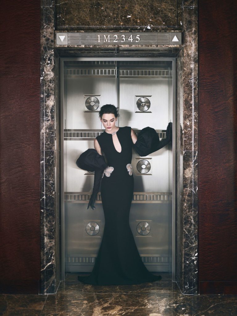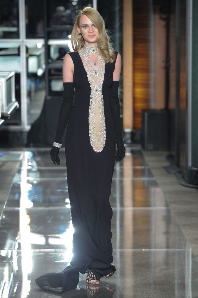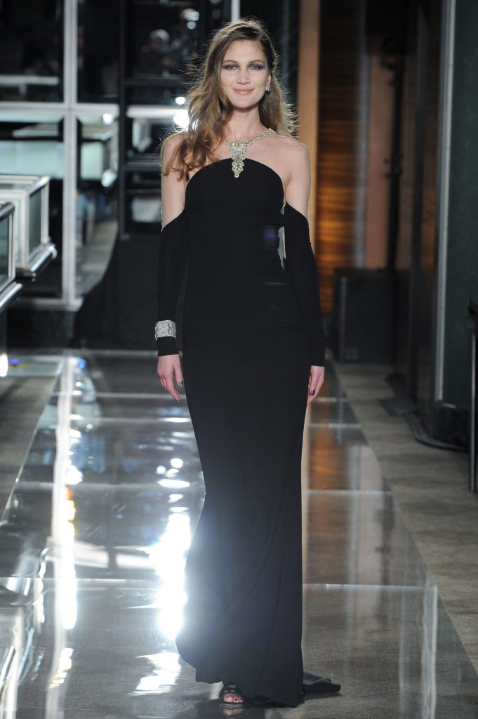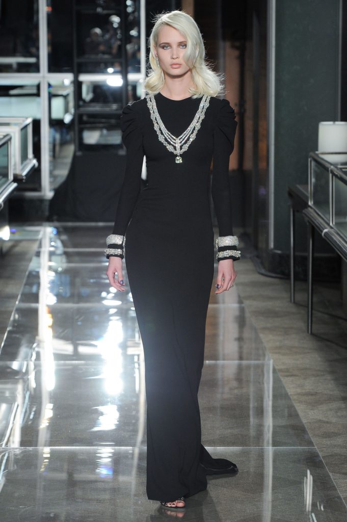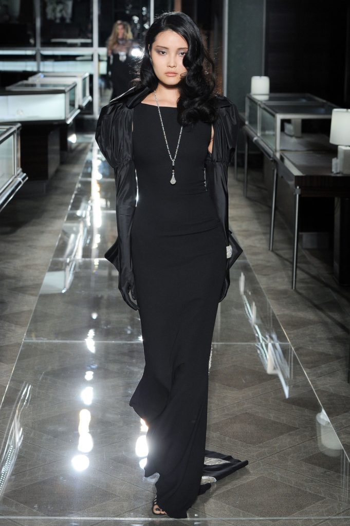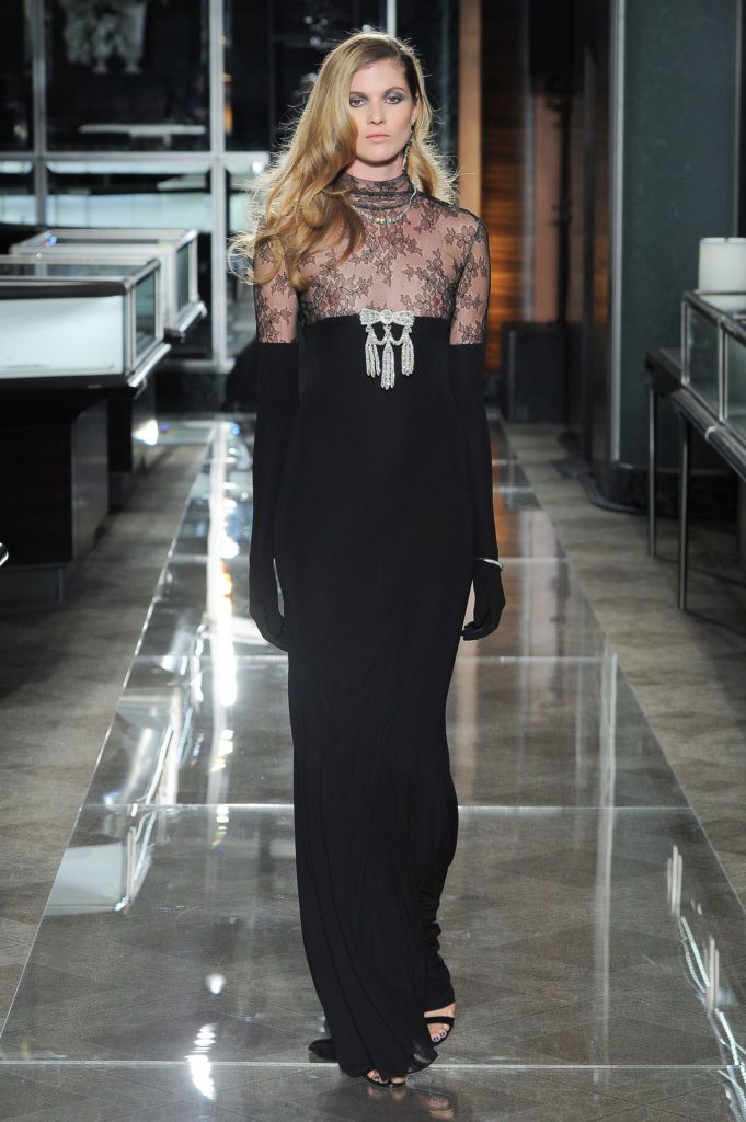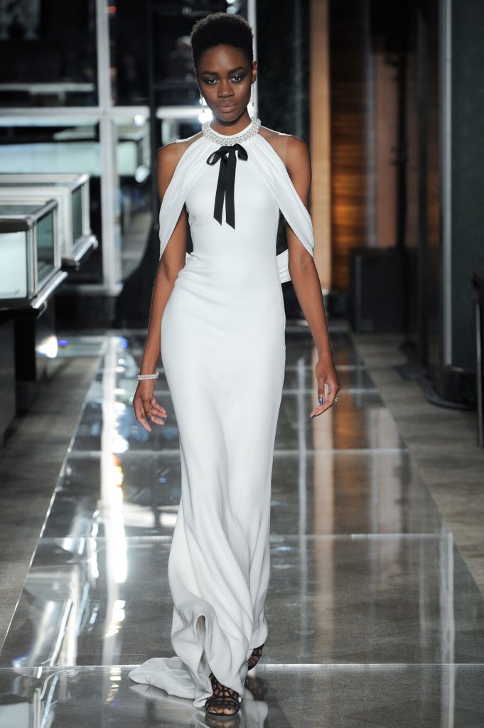 Dopo gli abiti da sera, ecco sfilare gli abiti da sposa couture: i primi sono esempi di abito da sposa bianco e nero, hanno dettagli gioiello e decori come cristalli e perle, applicati anche a guanti lunghi che richiamano sempre il glam del film evocato, con l'aggiunta di elementi neri come fiocchi e corpetti.