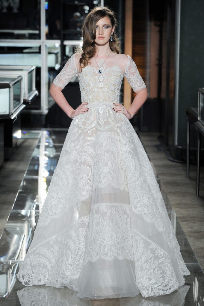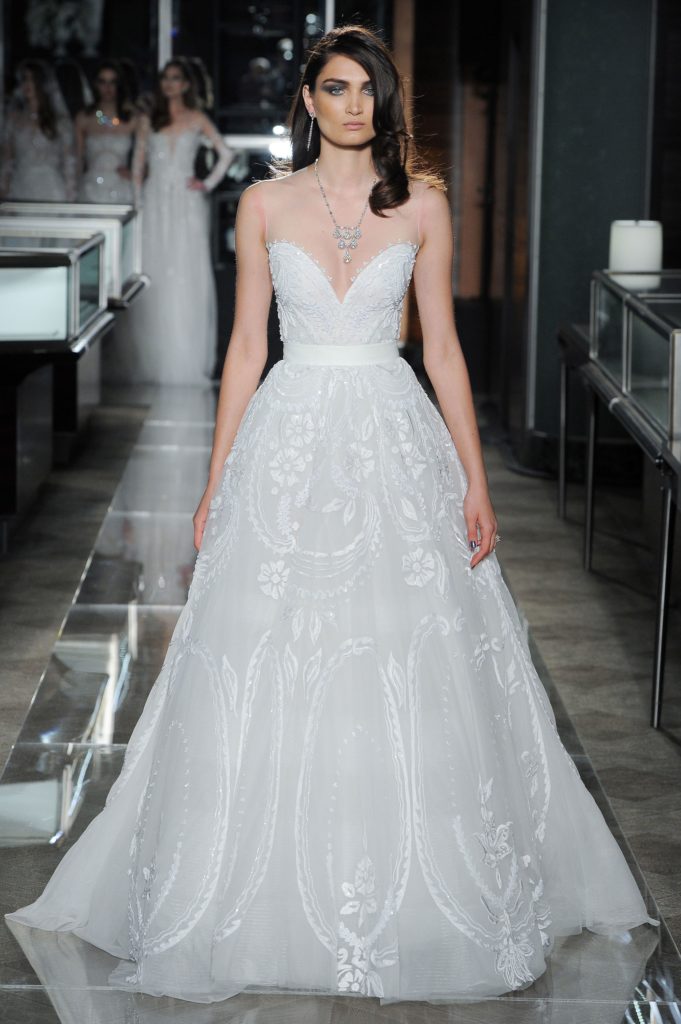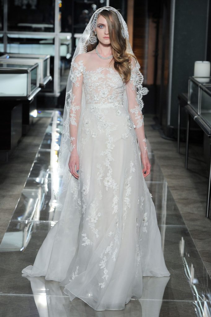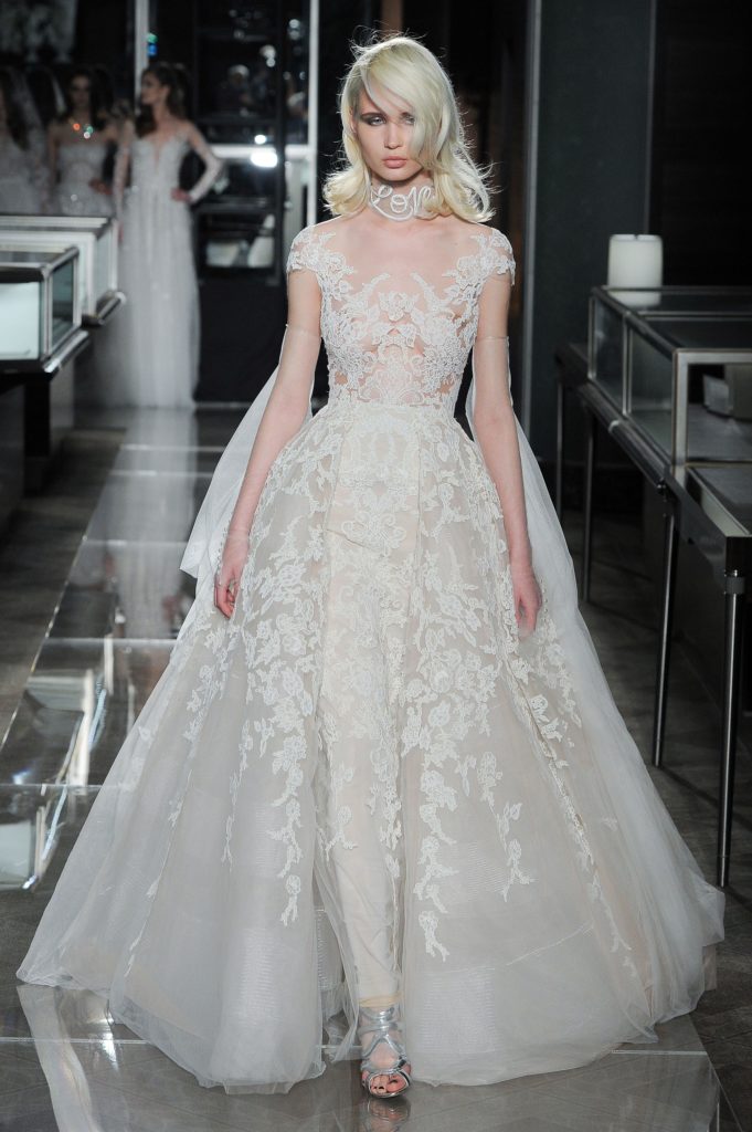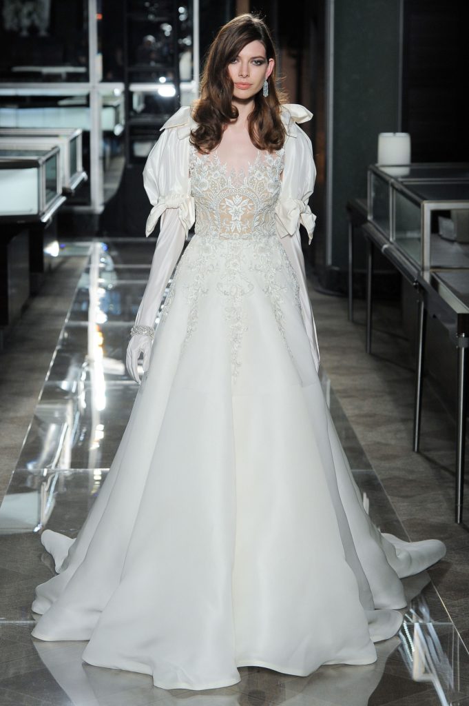 La collezione sposa Reem Acra Spring 2018 comprende anche abiti da sposa dallo stile inconfondibile del brand: le maniche a palloncino, le gonne in tulle, i corpetti velati ricamati, le frasi d'amore ricamate sul tulle (che avevamo già visto nella bellissima collezione sposa Reem Acra Spring 2014).