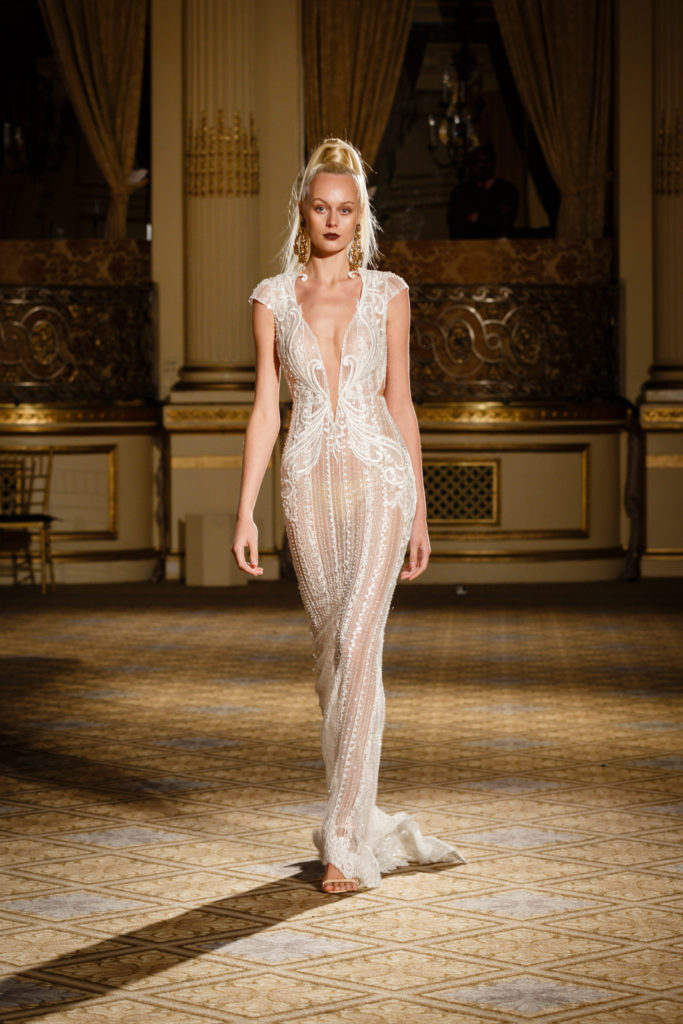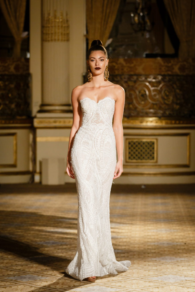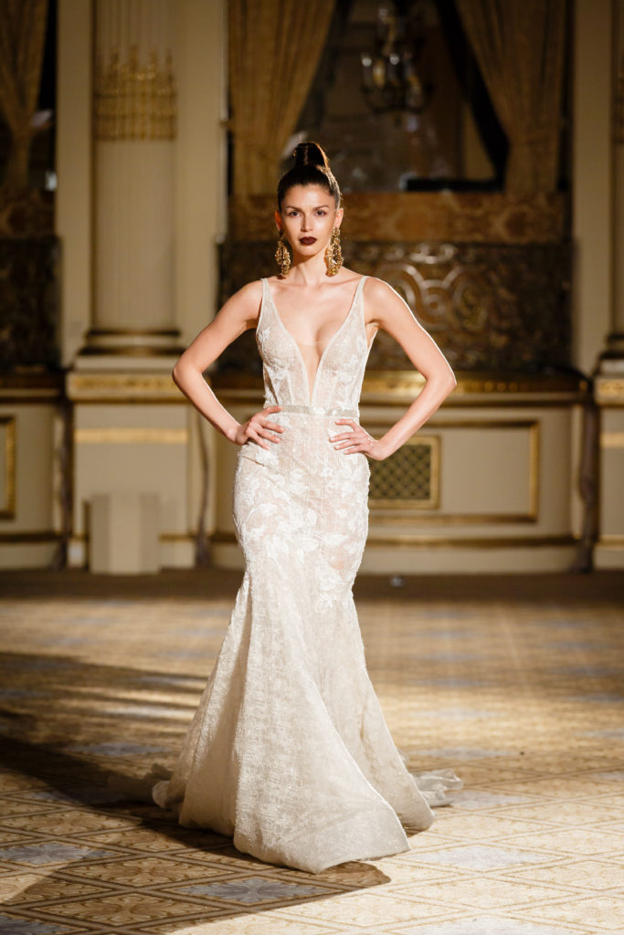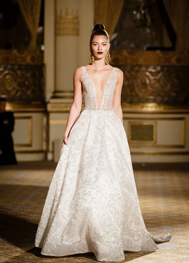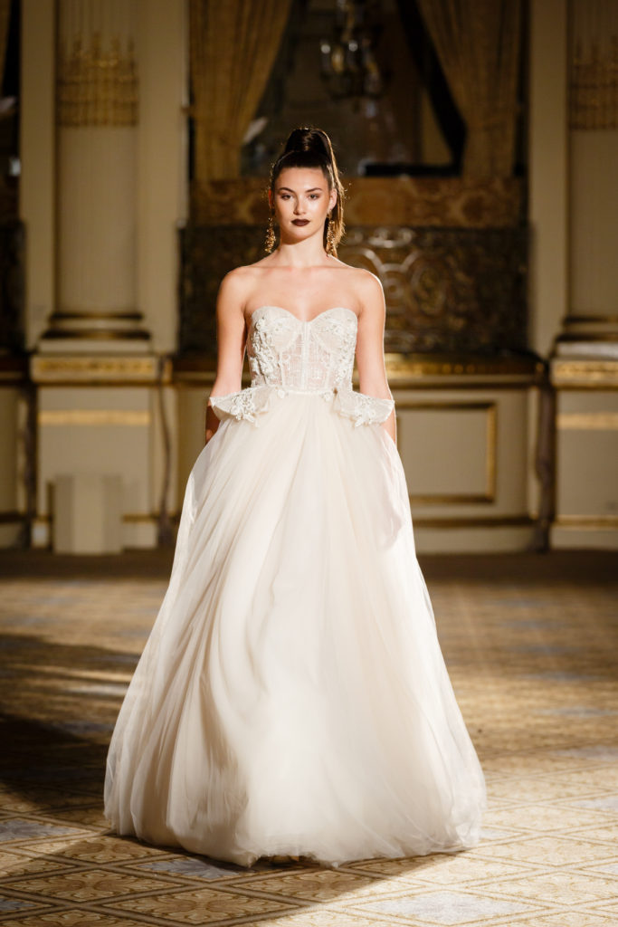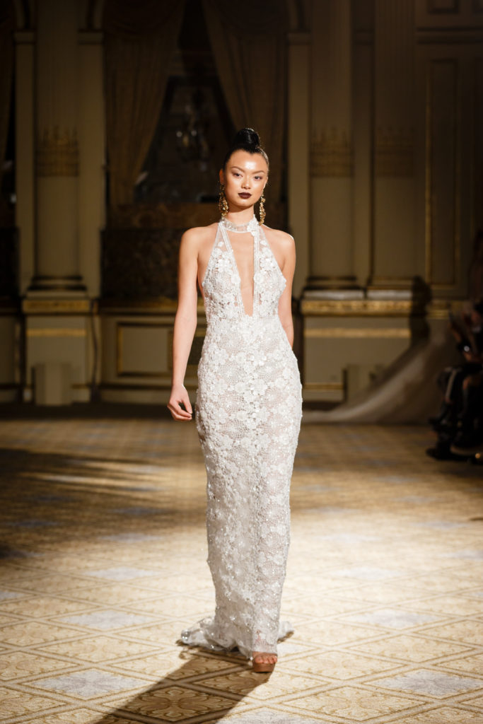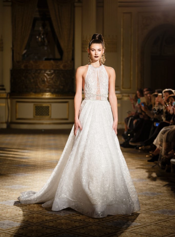 Gli occhi degli operatori della New York International Bridal Week sono stati puntati sui dettagli di questi unici abiti da sposa couture, come gli inserti in pizzo ricamato, le pailettes, i ricami Art Déco, i fili metallici e le piume.