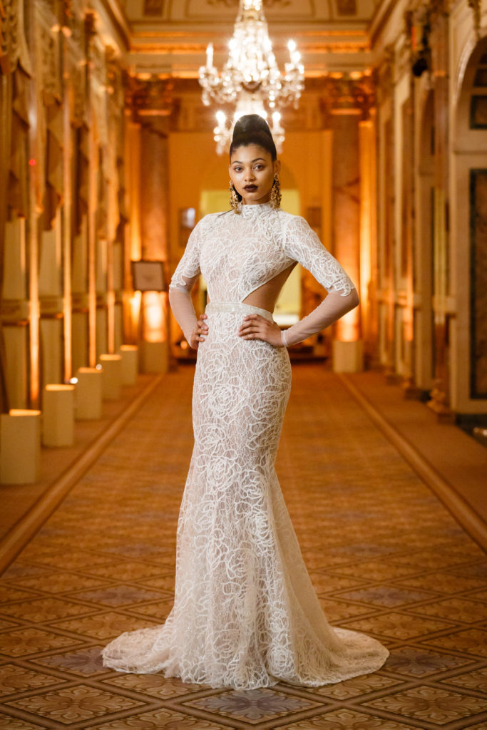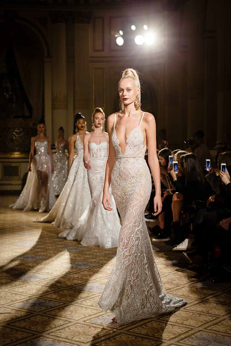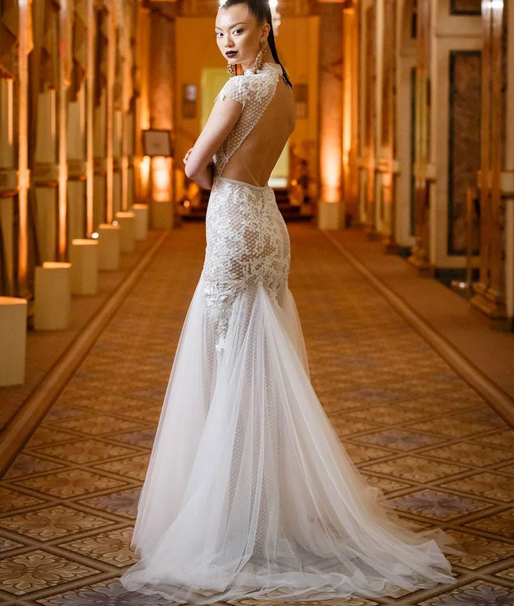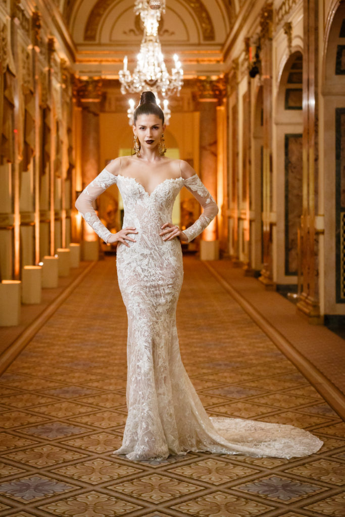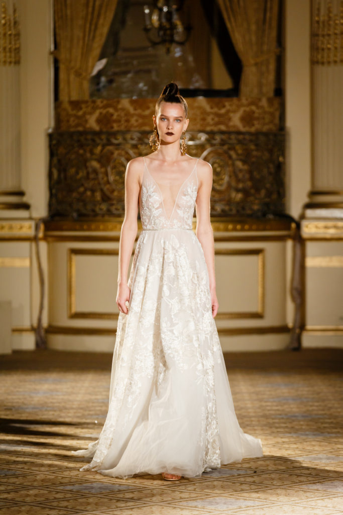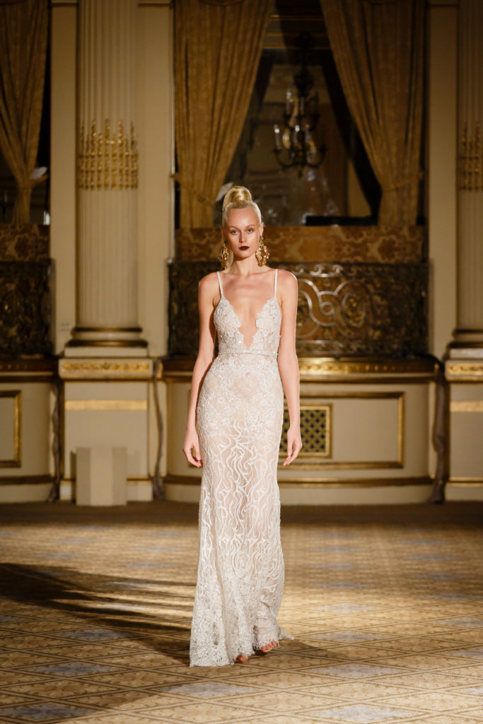 Gli occhi degli operatori della New York International Bridal Week sono stati puntati sui dettagli di questi unici abiti da sposa couture, come gli inserti in pizzo ricamato, le pailettes, i ricami Art Déco, i fili metallici e le piume.
