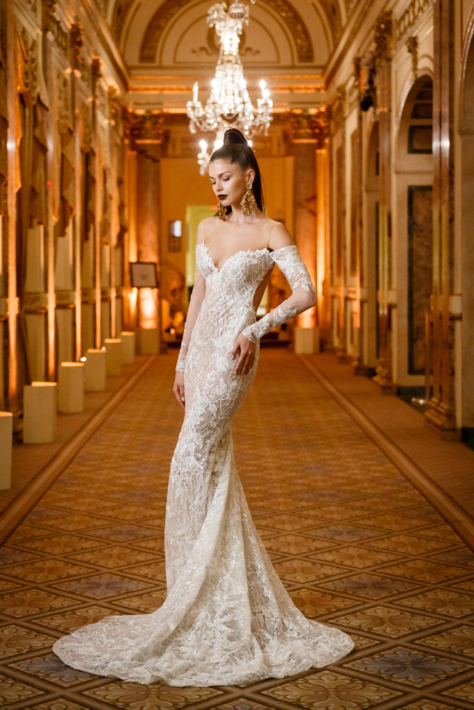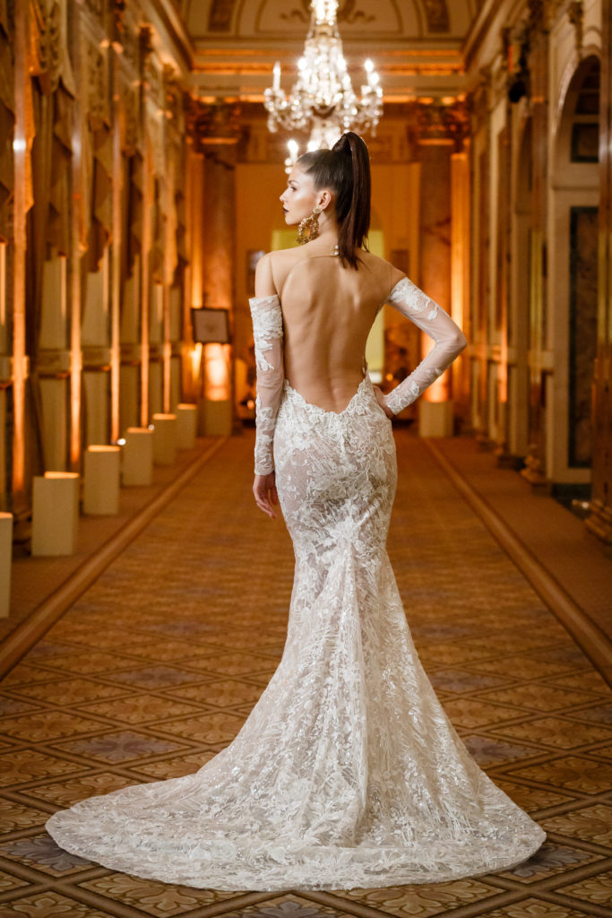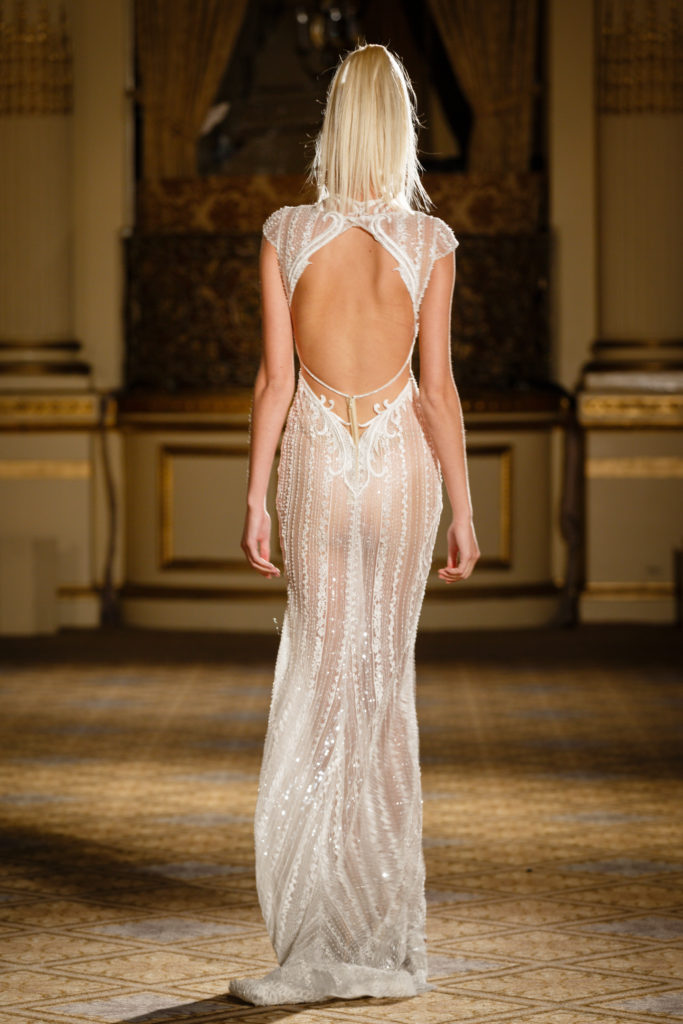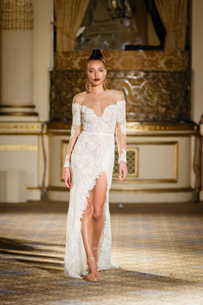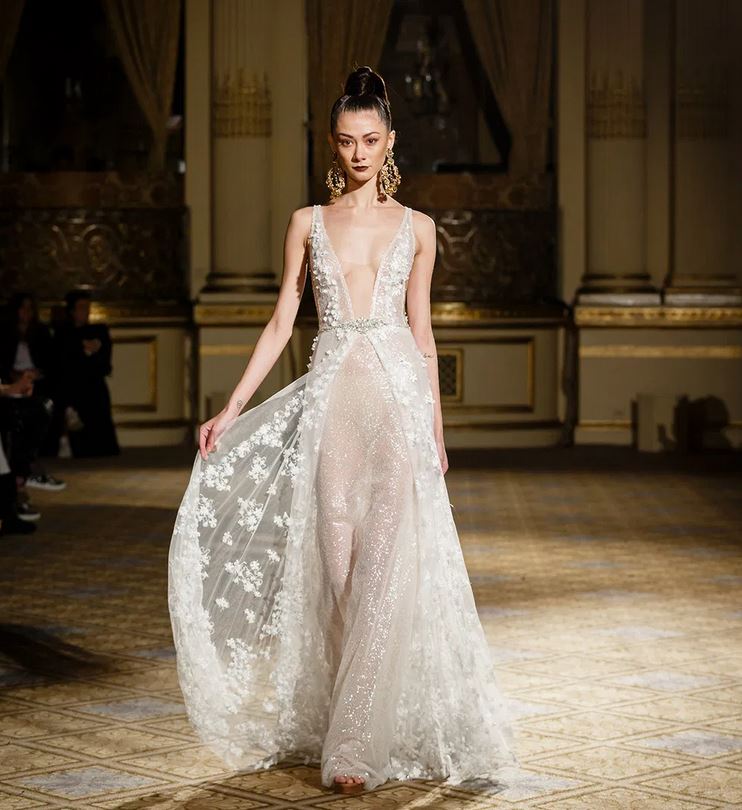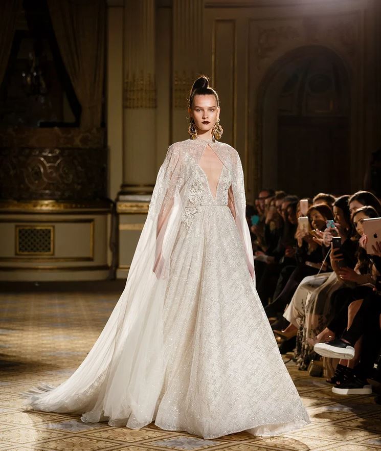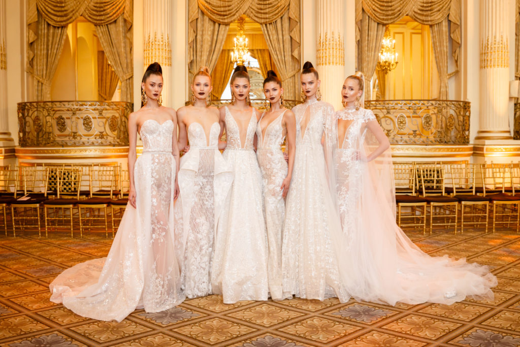 Gli occhi degli operatori della New York International Bridal Week sono stati puntati sui dettagli di questi unici abiti da sposa couture, come gli inserti in pizzo ricamato, le pailettes, i ricami Art Déco, i fili metallici e le piume.
