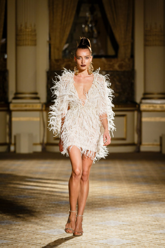 Spazio anche all'abito da sposa corto, proposto in una versione davvero glam, intermante ricperto di piume.