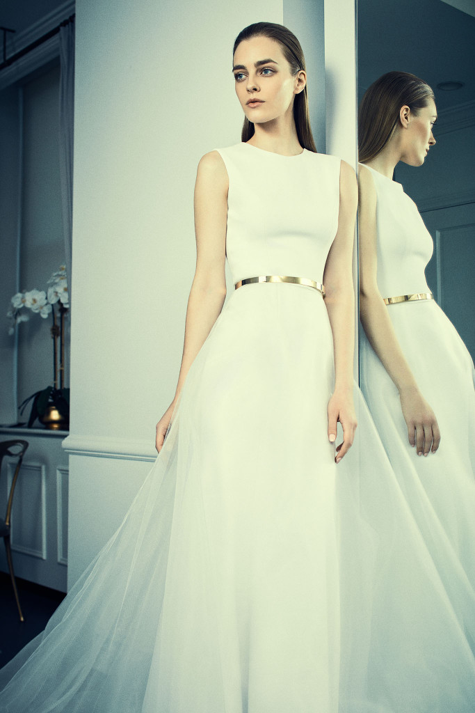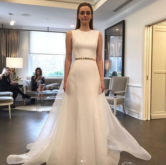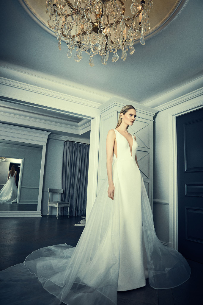 Non potevano mancare in questa collezione sposa Romona Keveza Spring 2018 gli abiti da sposa lineari, arricchiti da dettagli glam come le cinture metalliche, che caratterizzano lo stile unico della stilista.