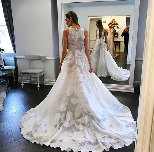 Romantico e glam l'abito da sposa in organza a stampa floreale, nei toni del bianco.