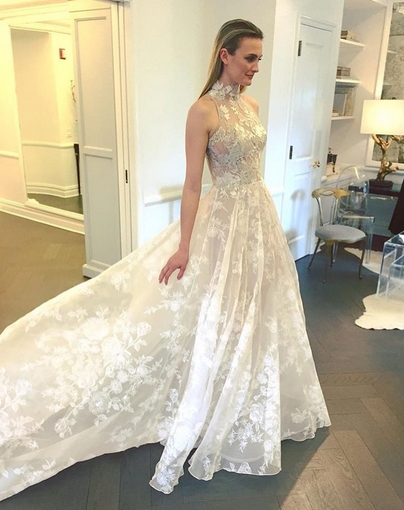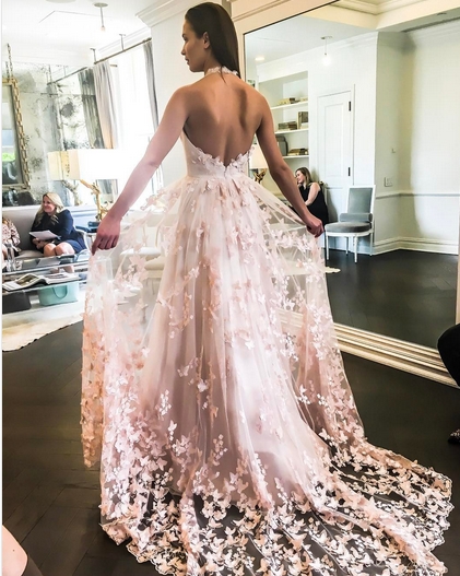 Davvero splendidi in questa collezione sposa Romona Keveza Spring 2018 gli abiti da sposa con collo a canotta, proposti nella versione in pizzo o con farfalle applicate come vediamo nel bellissimo abito da sposa rosa.