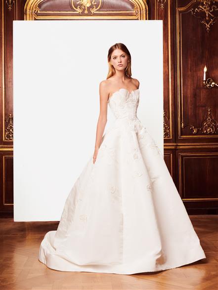 In chiusura di questa collezione sposa Oscar de la Renta Fall 2018, un abito da sposa senza tempo: un ball gown senza spalline nei toni avorio con applicazioni floreali, che richiama inconfondibilmente lo stile del compianto designer.