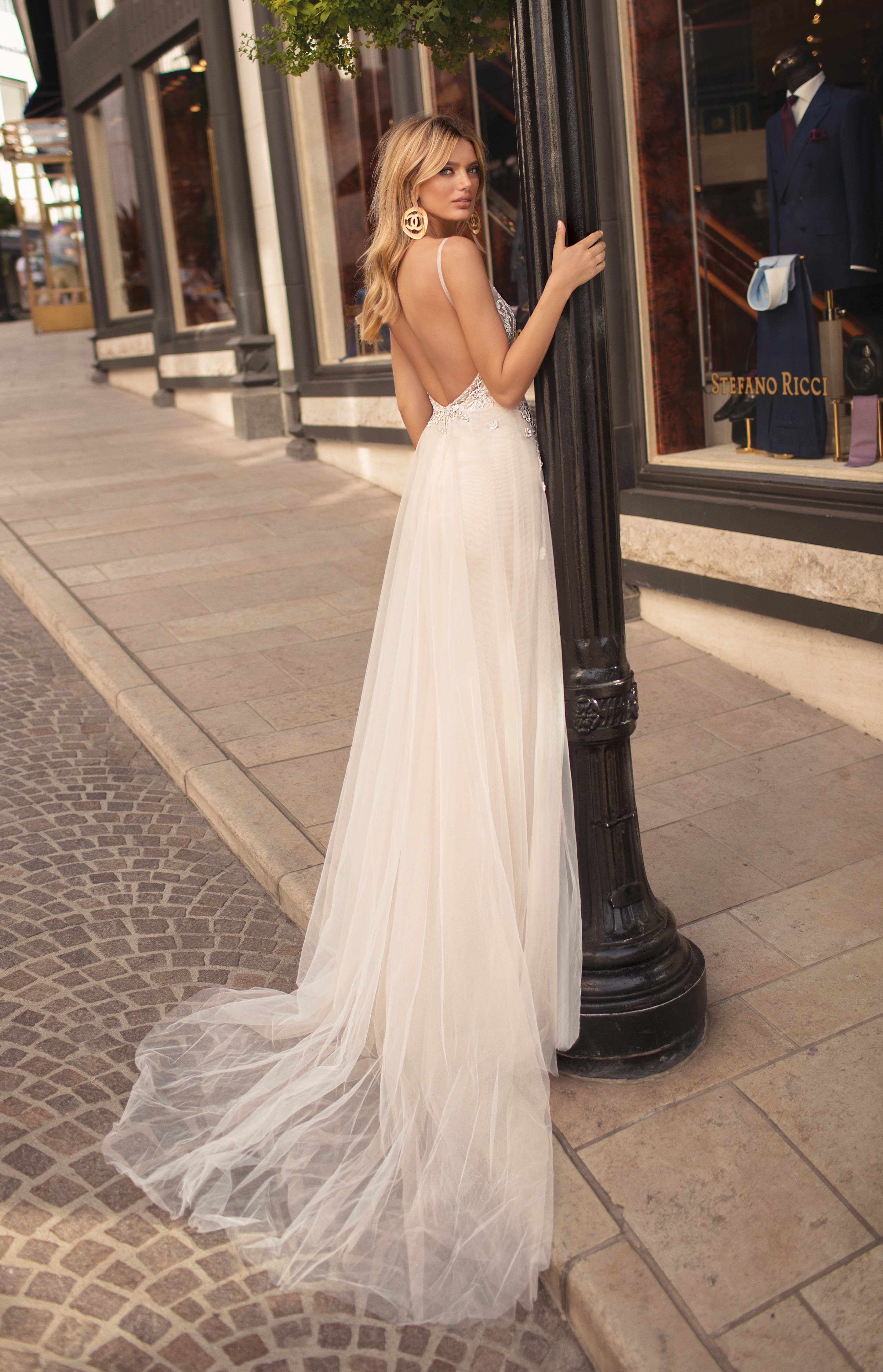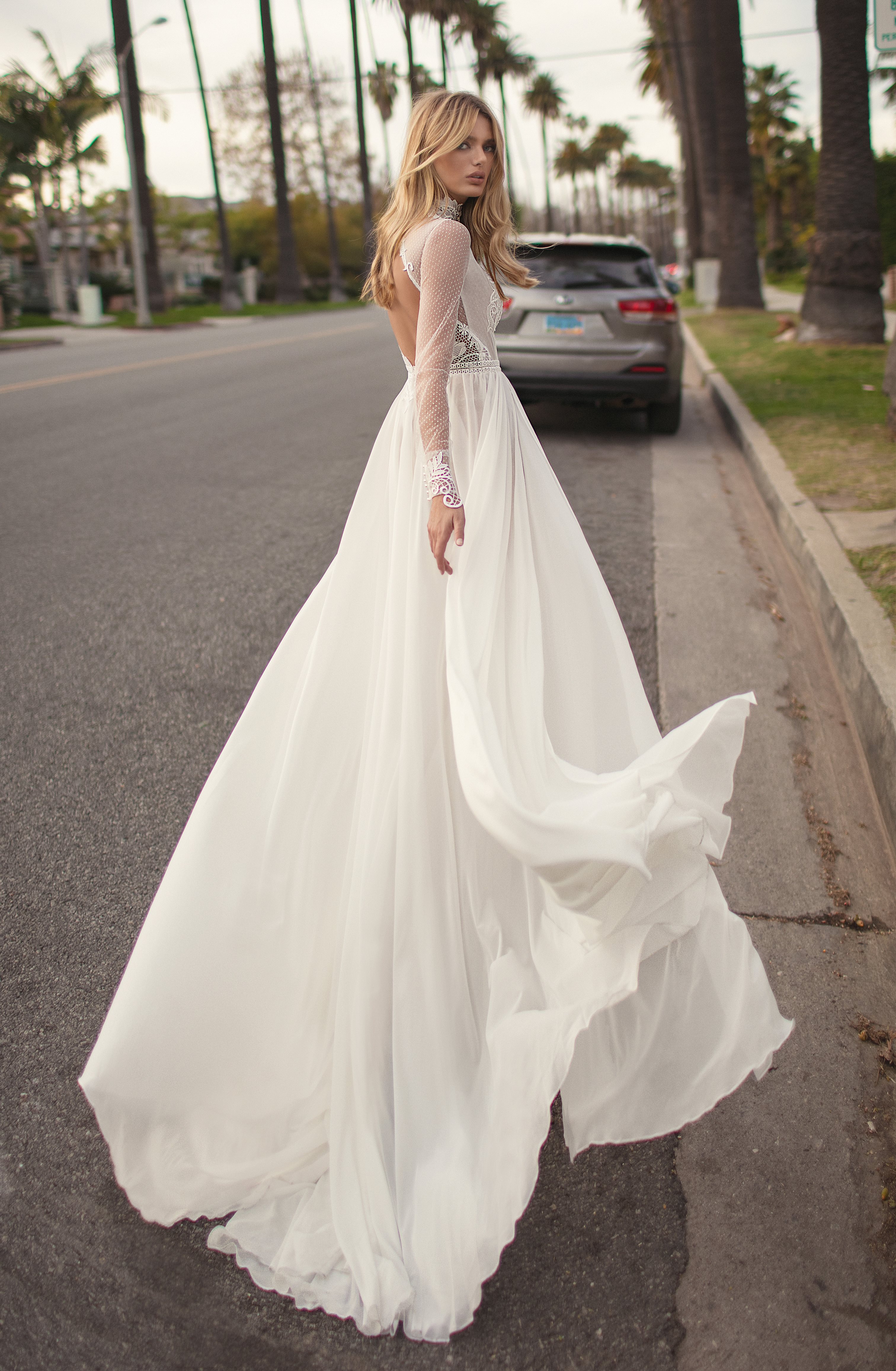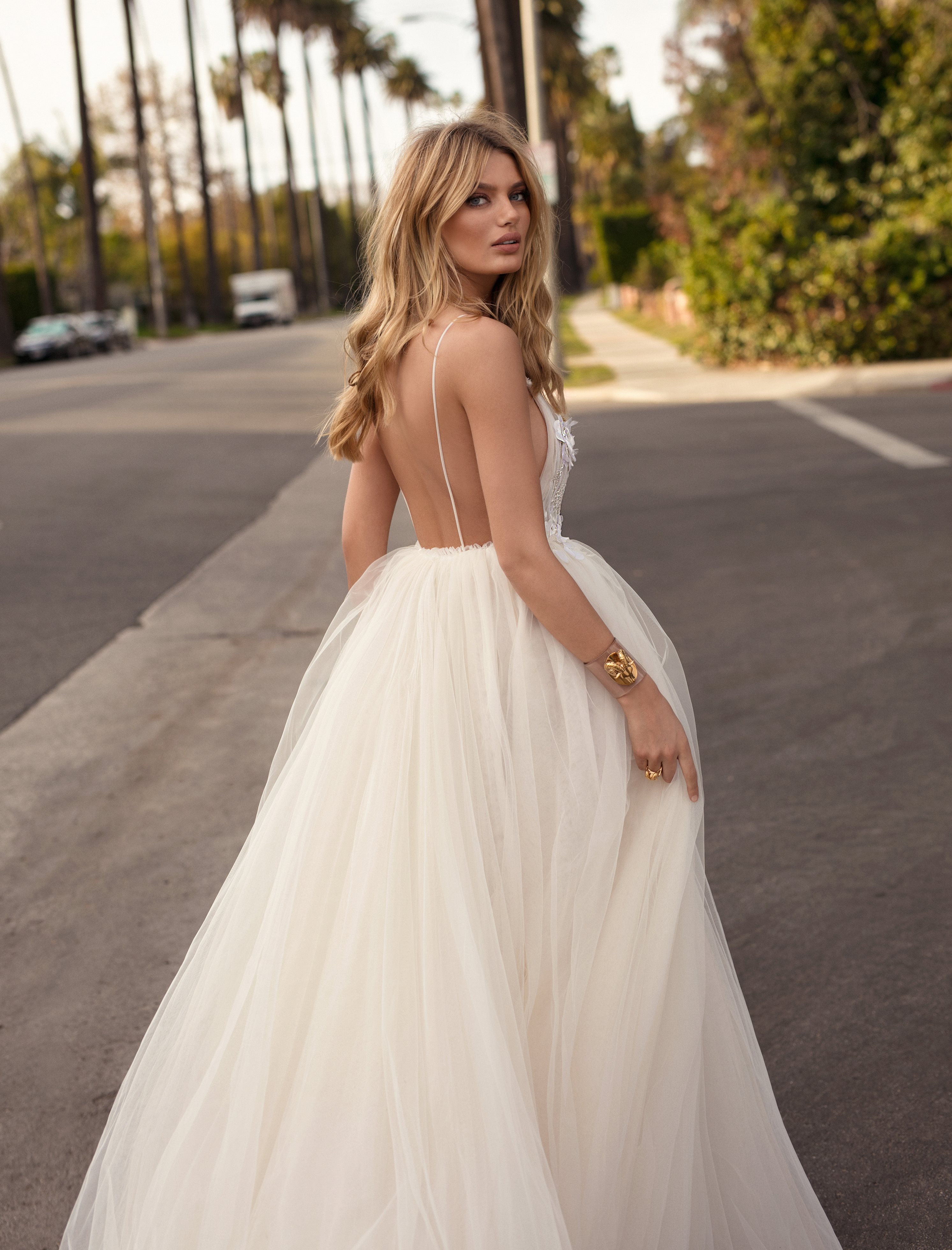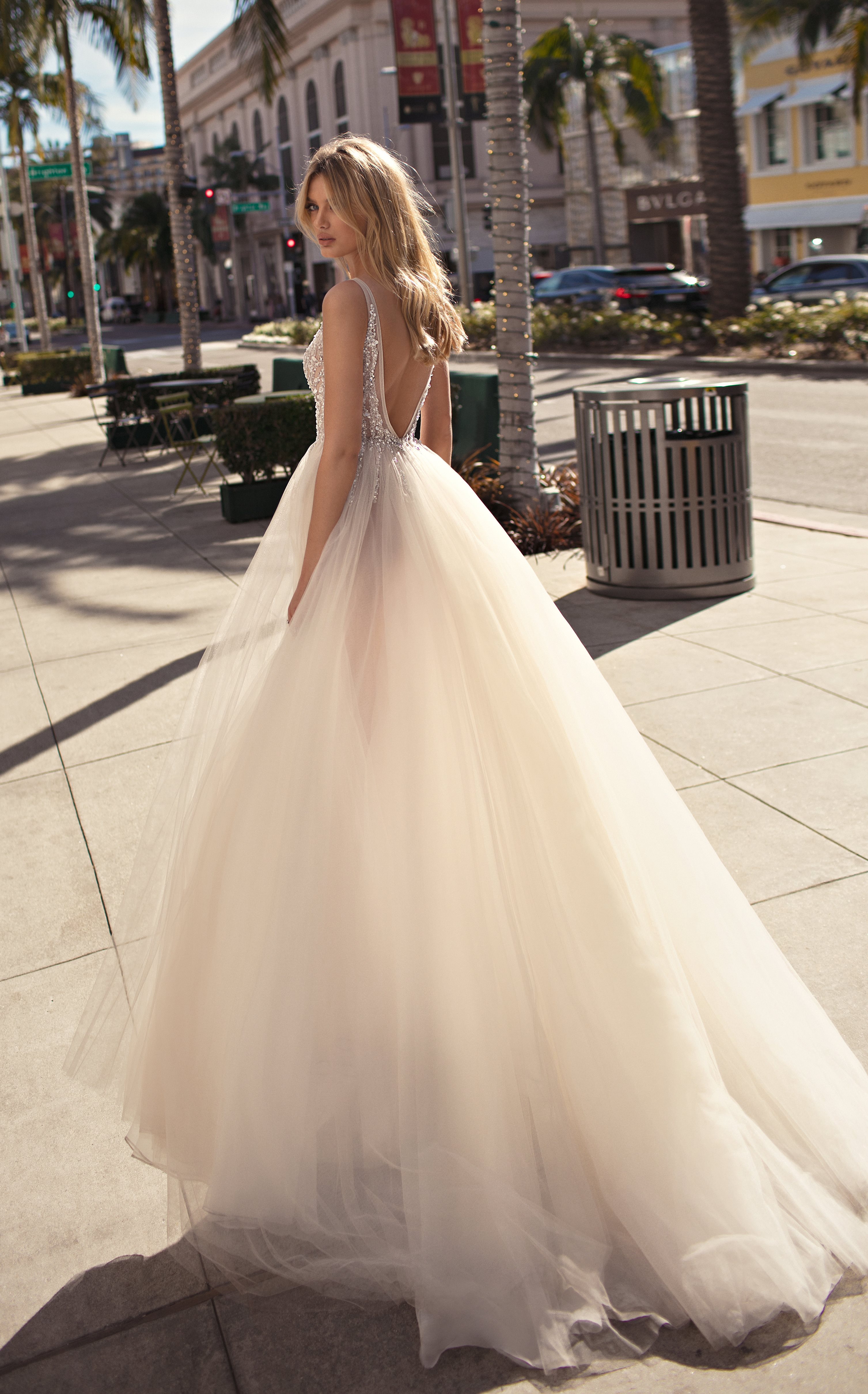 Le strade dello shopping di Rodeo Drive a Beverly Hills, dove è ambientata la campagna fotografica, sono la cornice ideale per questi abiti da sposa stravaganti.