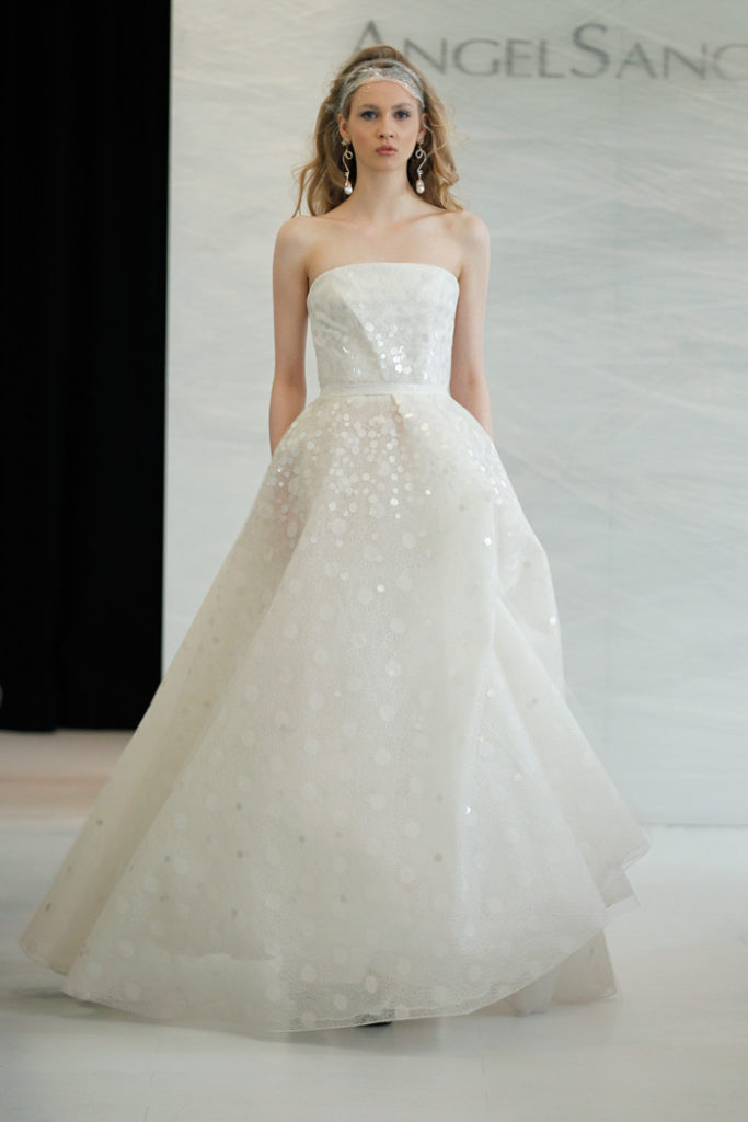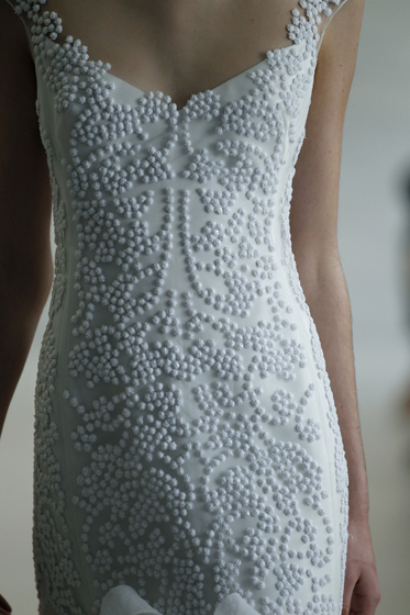 Ecco un abito senza spalline - in vendita in Usa al prezzo di 5.940 dollari - con corpetto drappeggiato e ricami in perline color ghiaccio che continuano su una linea fino alla balza sopra alla gonna.