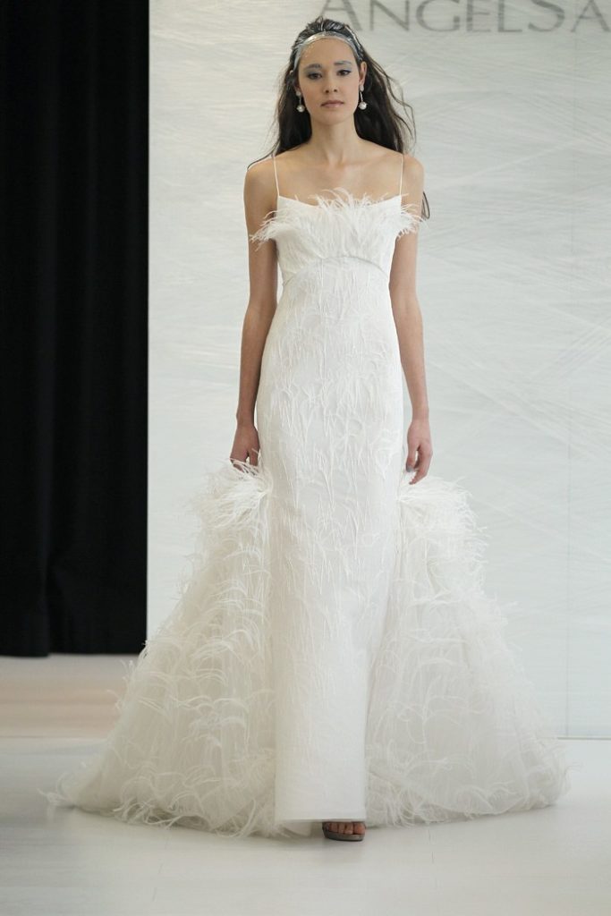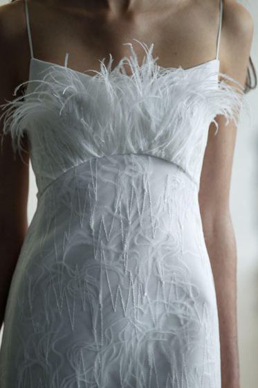Non mancano le piume, leggerissime e delicatissime applicate ad un modello ultra glamour.