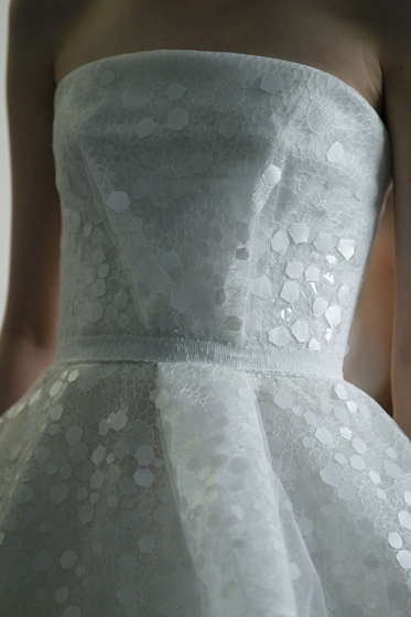 Lo stilista gioca con la luce e i tessuti. Elemento della sfilata è l'introduzione dell'acetato, applicato attraverso sottilissimi quadratini che danno l'effetto di madreperla opalescente.