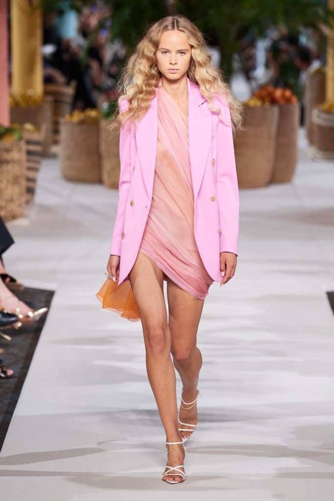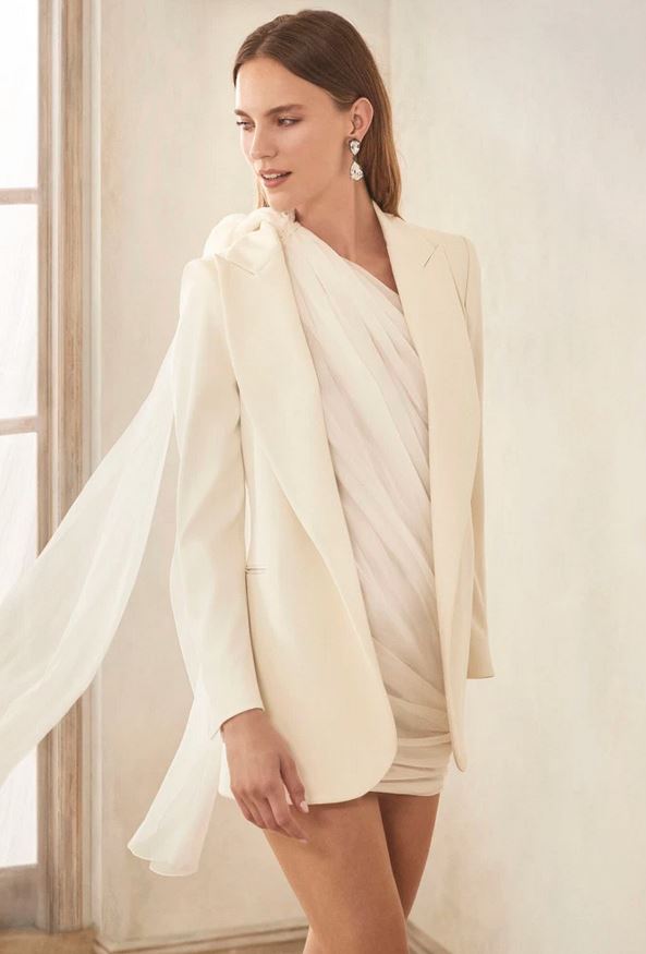 Ecco quindi che il miniabito in tulle color cipria abbinato a blazer nei toni orchidea viene proposto anche nella versione sposa, nei toni avorio.
