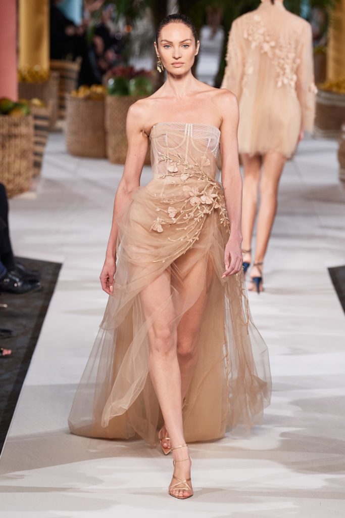 L’abito bustier in tulle con ricami floreali e orlo rialzato proposto in cipria nel RTW, viene riproposto per la sposa.