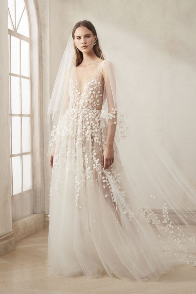 Non potevano mancare gli abiti da sposa in pizzo e dai ricami floreali, tessuto signature del brand Oscar de la Renta, proposti in abbinamento al tulle per un effetto sofisticato e velato.