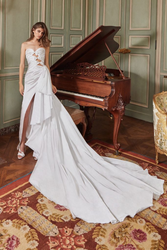 Effetto lucido anche per l’abito da sposa drappeggiato in duchesse di seta con tagli e fiocchi sul corpetto. L’abito ha uno strascico davvero strepitoso e spacco decisamente glam sul davanti.