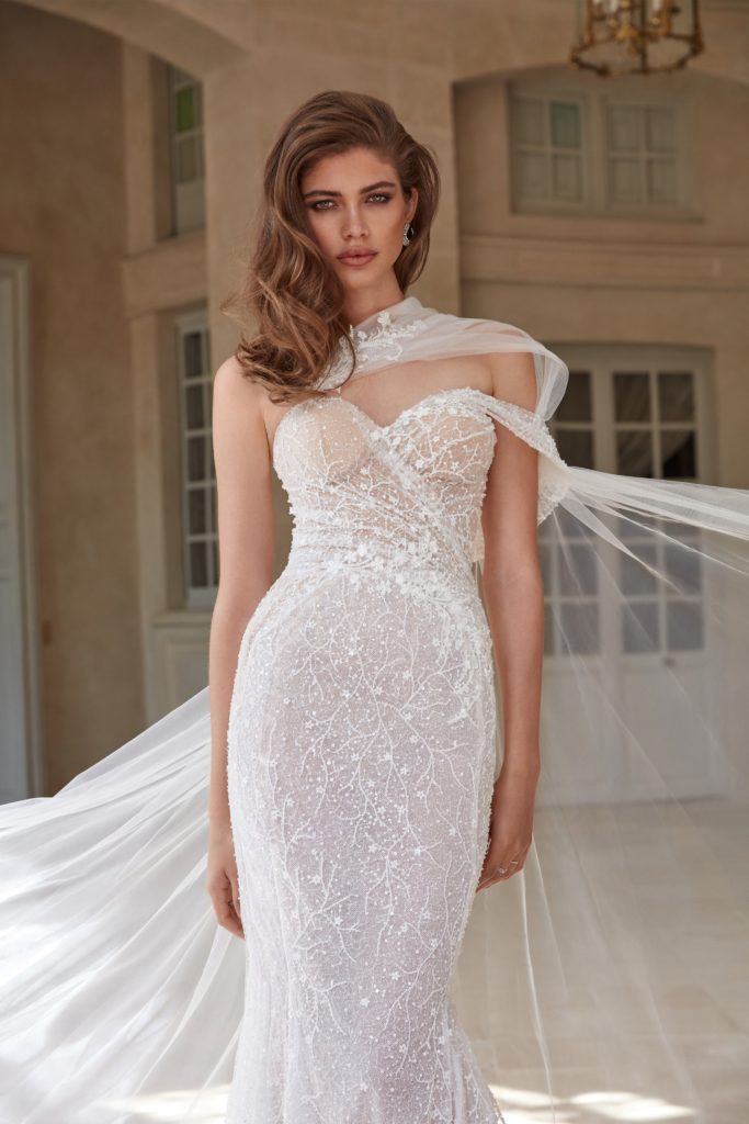La collezione si sofferma anche sul pizzo, modulato su diversi design e spaziando dall’abito da sposa stile Grace Kelly all’abito da sposa a sirena con scollo a cuore e ampio spacco.